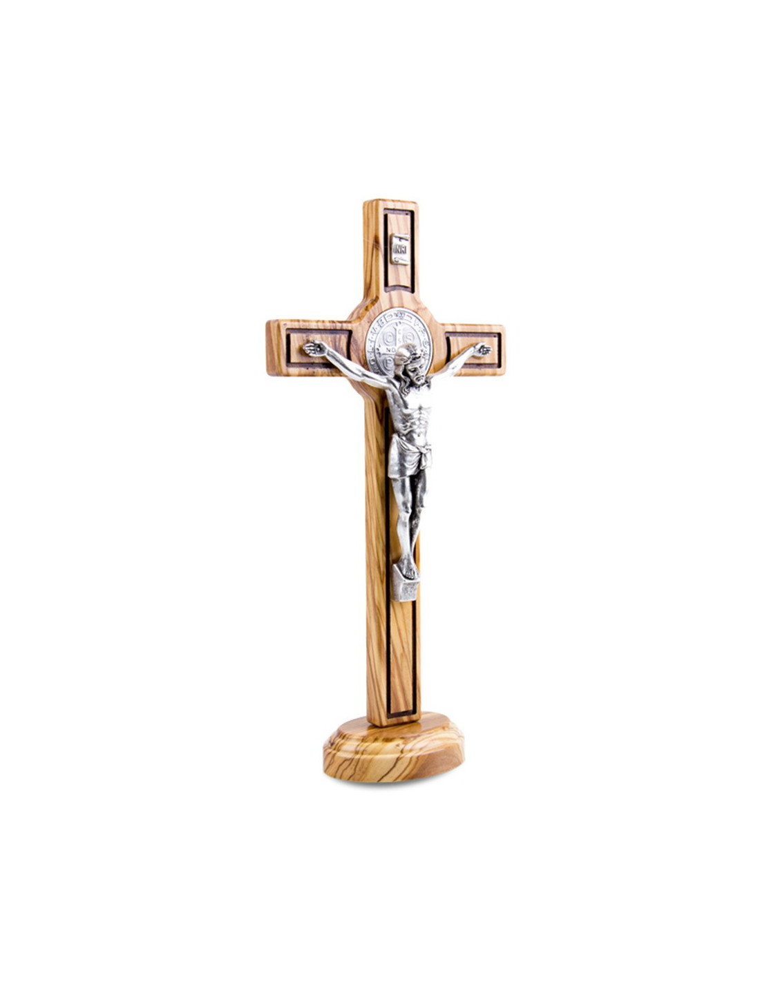 Croce di San Benedetto da 30 cm in legno d'ulivo naturale, montata su base, con medaglia di San Benedetto e Cristo argentata. Un potente simbolo di fede e protezione.