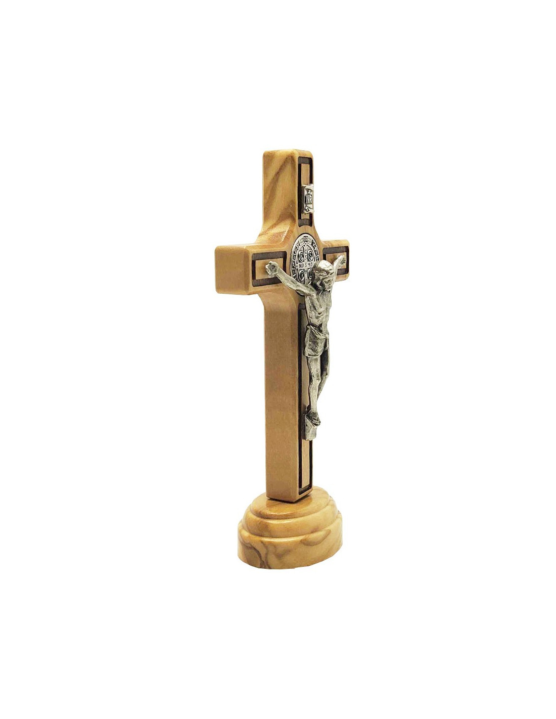 Questa croce di San Benedetto in legno d'ulivo è un magnifico oggetto spirituale, sobrio e al tempo stesso intriso di forza. Montata su base, si distingue per la calda bellezza del suo legno d'ulivo naturale, impreziosita dalla presenza di Cristo e della medaglia di San Benedetto, entrambi realizzati in metallo argentato finemente lavorato. La medaglia di San Benedetto, posta al centro della croce, è un potente simbolo di protezione dal male e dalle prove. Si ritiene che offra protezione spirituale contro le influenze negative e le forze del male. Le iscrizioni latine che reca invocano la benedizione divina e la difesa contro il male in tutte le sue forme. Il legno d'ulivo è da sempre simbolo di pace, perseveranza e fedeltà. Utilizzato per oggetti sacri, collega la preghiera quotidiana a profonde radici bibliche, richiamando in particolare i luoghi santi di Gerusalemme e la forza spirituale offerta dalla natura.