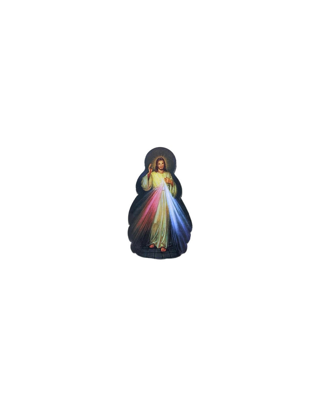 Questo magnete di Cristo Misericordioso è stato realizzato in una tavoletta di legno di 5 mm di spessore. È ritagliato nella forma dell’immagine a colori del corpo intero di Cristo. Dimensioni: 2,5 × 5 cm.