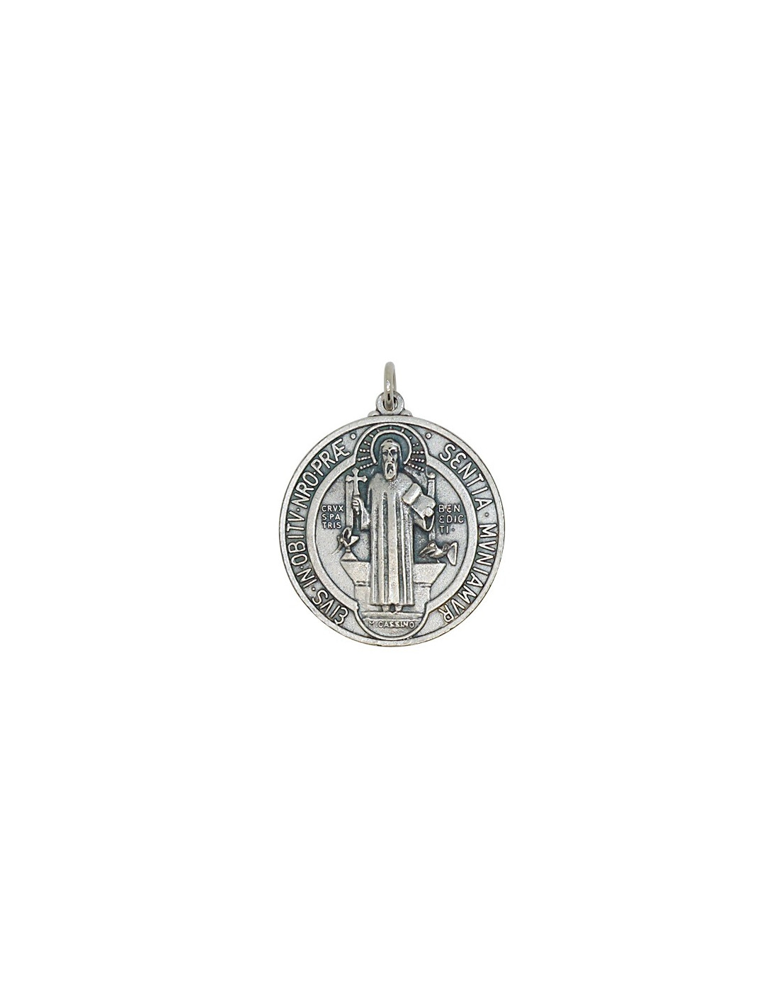 Questo ciondolo rotondo in metallo argentato è l'effigie della Medaglia di San Benedetto. Questa medaglia, secondo la religione cattolica, è un potente simbolo di protezione contro il Male, le energie e le persone negative o malevole. Diametro: 4 cm.