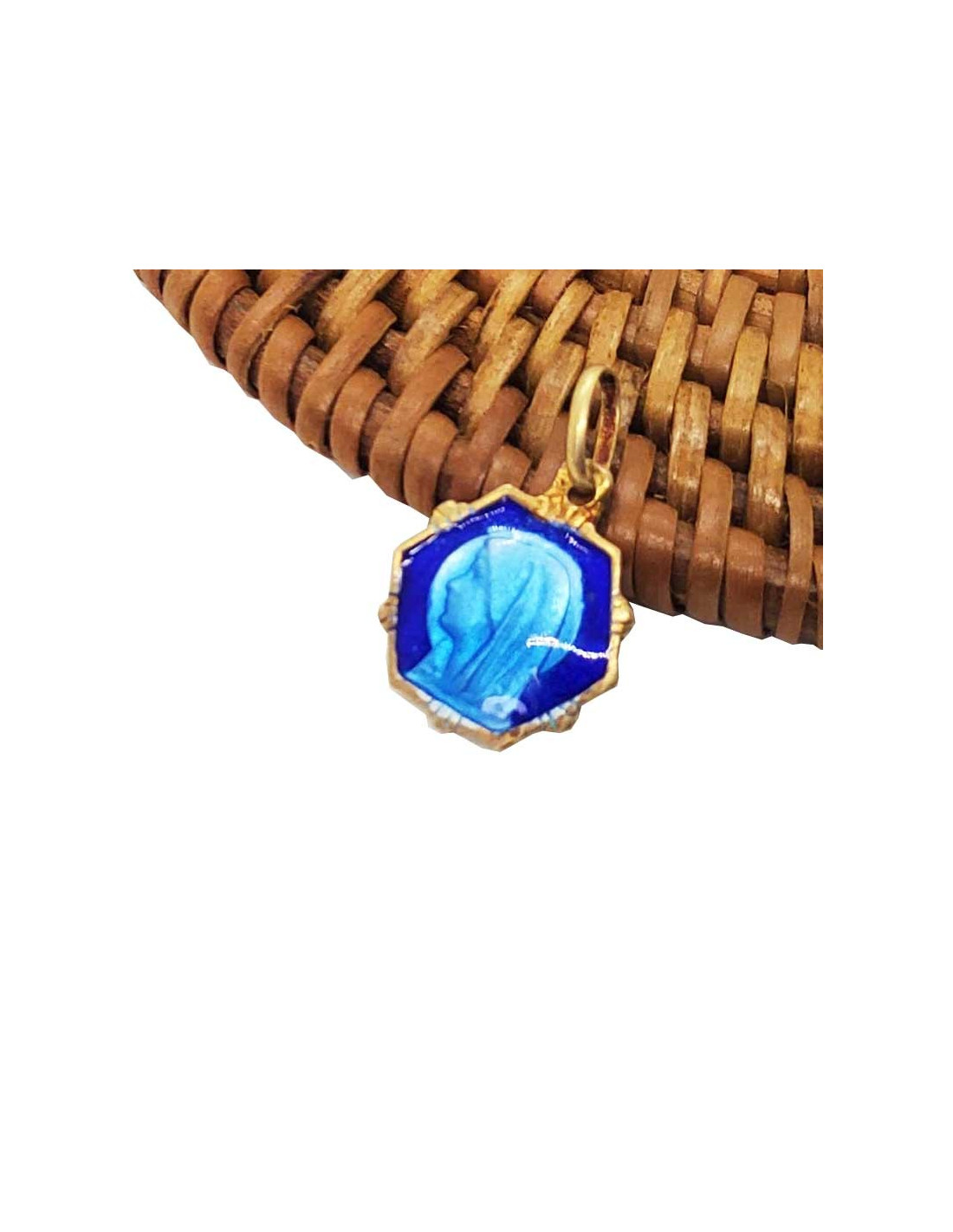 Immergiti nella spiritualità e nella bellezza con la nostra medaglia in metallo dorato smaltata blu, un'opera di grande finezza. Questa medaglia esagonale è una raffigurazione della Vergine Maria sul davanti, catturando la sua grazia e benevolenza nei più piccoli dettagli.