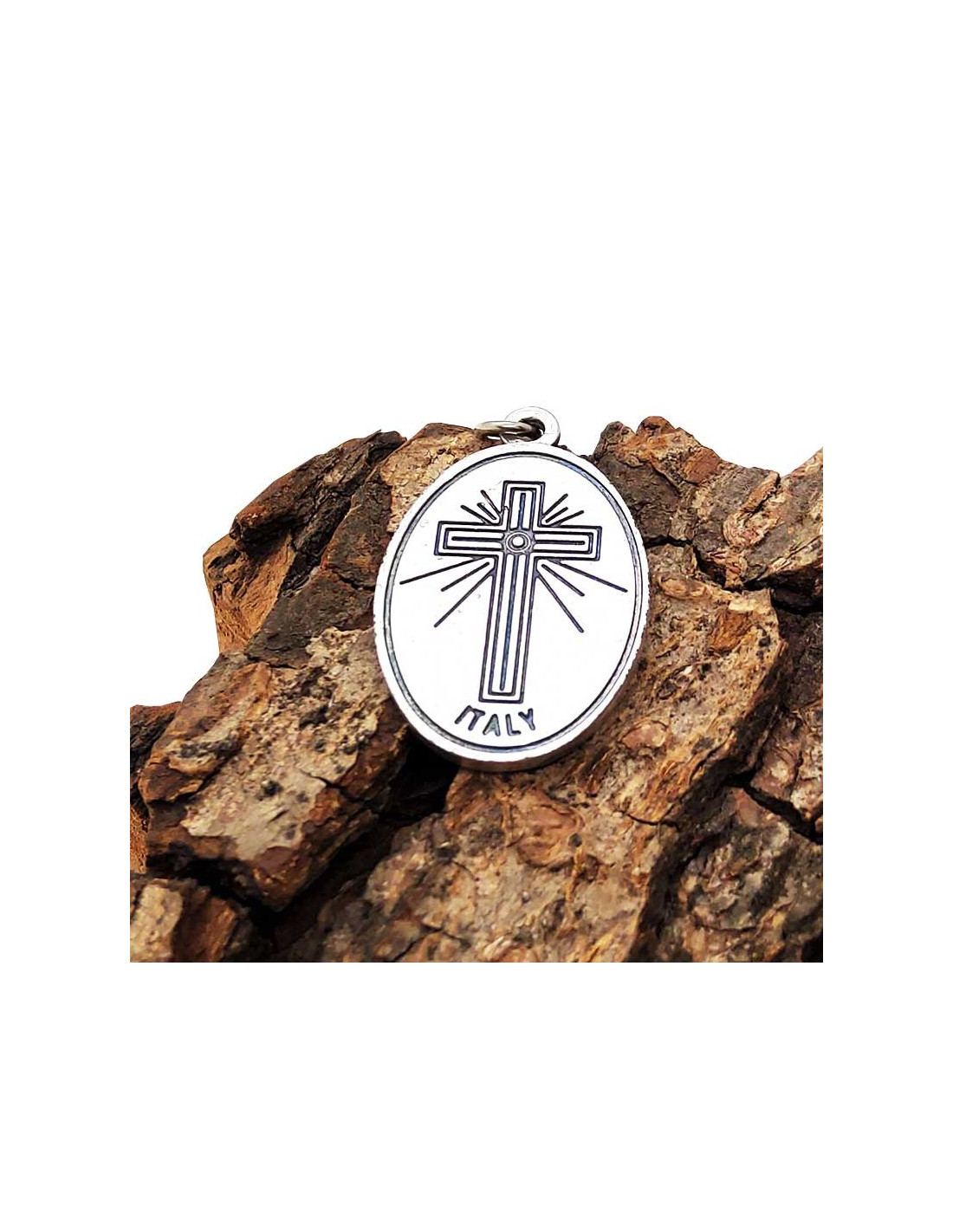 Medaglia argentata dell'Arcangelo San Raffaele. Questo ciondolo fantasia è di forma ovale. L'immagine in bassorilievo è finemente scolpita e rappresenta l'angelo su un pesce sopra l'acqua. Si prega San Raffaele per trovare l'amore e l'anima gemella, per benedire le coppie e incoraggiare la comprensione e la comunicazione tra i partner innamorati. È anche un angelo guaritore che opera miracoli di cura e guarigione. Protegge i viaggiatori per terra, per mare e per aria.