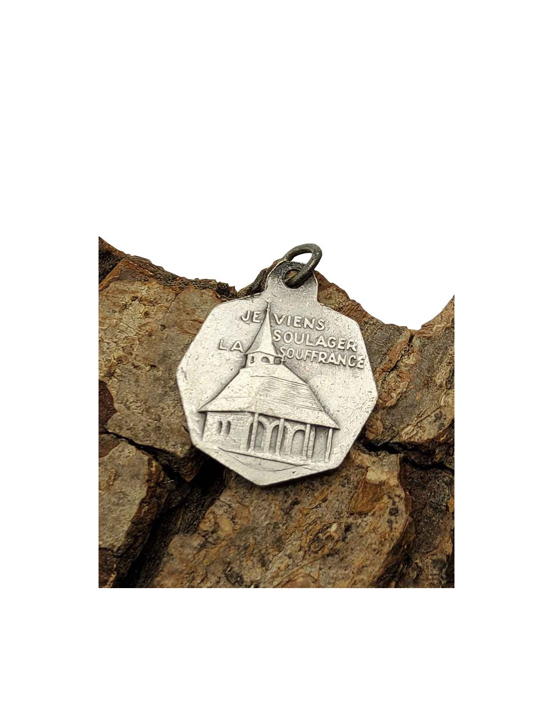 Medaglia ottagonale della Vergine dei Poveri di Banneux Notre-Dame, apparsa otto volte alla piccola Mariette Beco. Medaglia di fantasia in metallo grigio-argento. È un bel ricordo di questo luogo santo il cui miracolo è riconosciuto dalla Chiesa. Il retro illustra la cappella costruita da Mariette Beco, con le parole della Vergine trasmesse a Mariette: “Vengo ad alleviare le sofferenze”.