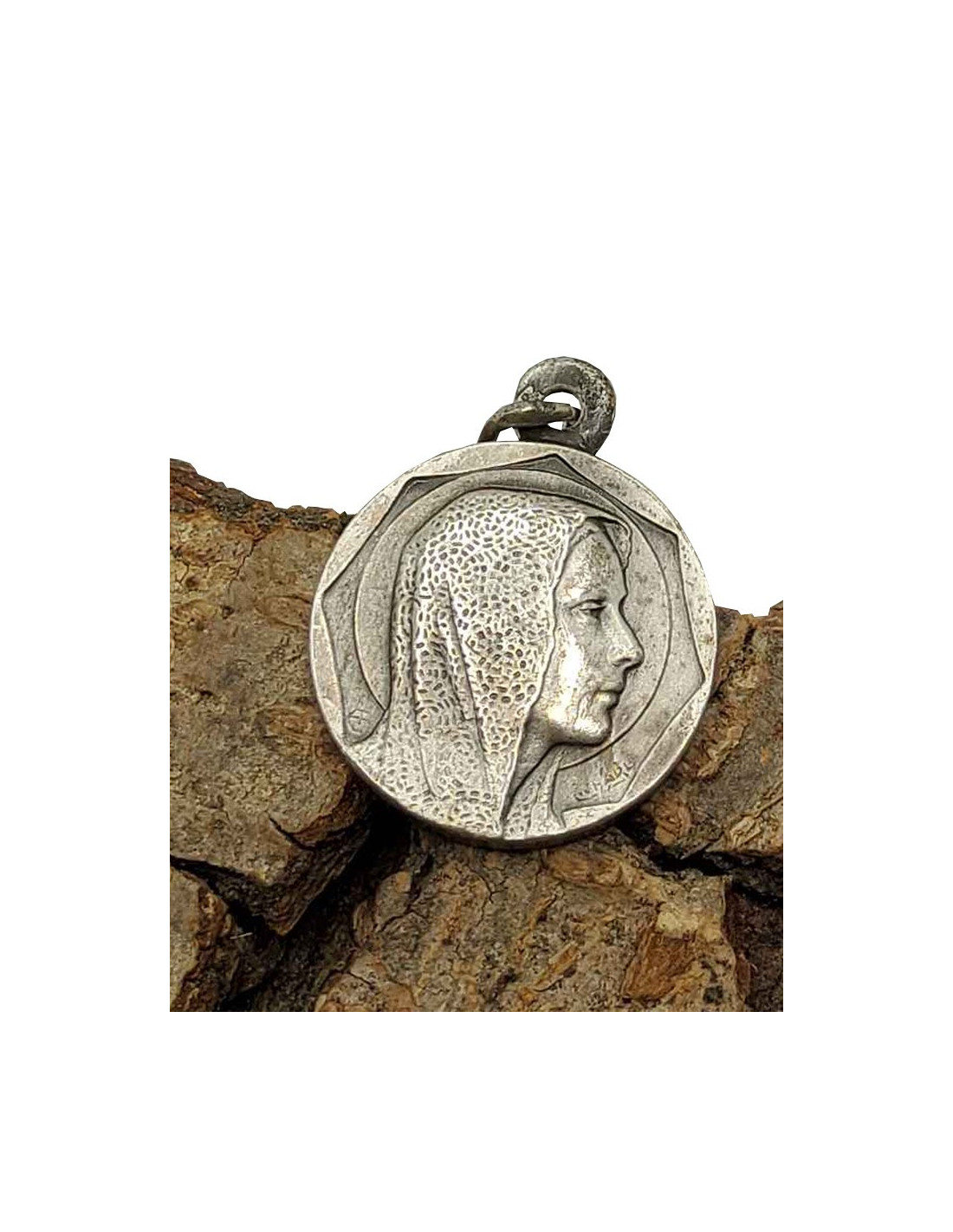 Medaglia rotonda raffigurante la Beata Vergine Maria, con il suo ritratto aureolato di luce e il suo velo con rose in pizzo. Medaglia di fantasia in metallo grigio-argento. Un bel ricordo di questo luogo santo, il cui miracolo è riconosciuto dalla Chiesa. Il retro illustra l'apparizione della Vergine dei Poveri, vista da Mariette Béco che fu testimone di 8 apparizioni, con la scritta “Notre Dame de Banneux” in francese intorno all'immagine.