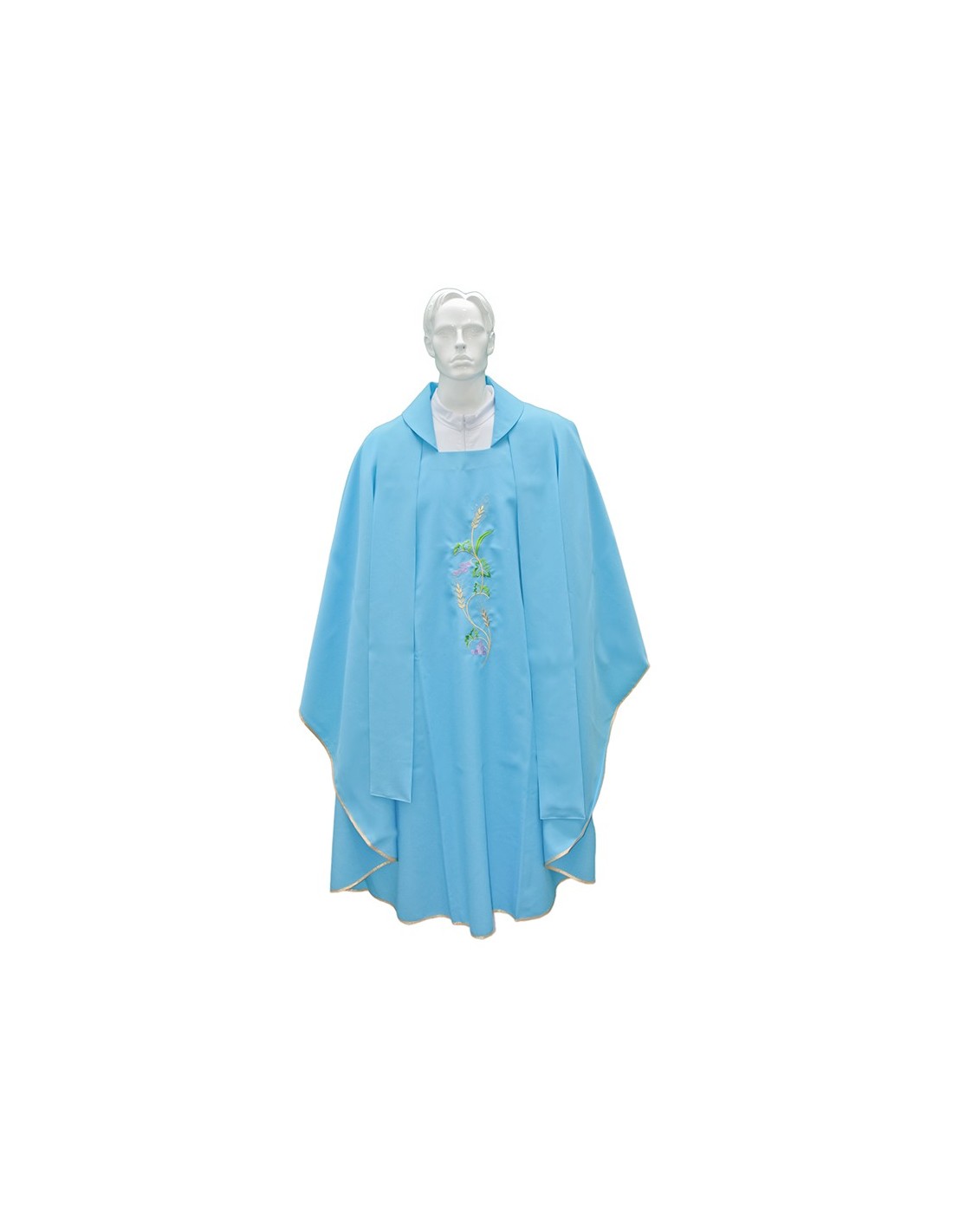 Casula per sacerdoti, di colore azzurro con stola con uva e spighe di grano in bellissimi arabeschi. La casula è decorata con un bordo dorato. Il ricamo è double-face.