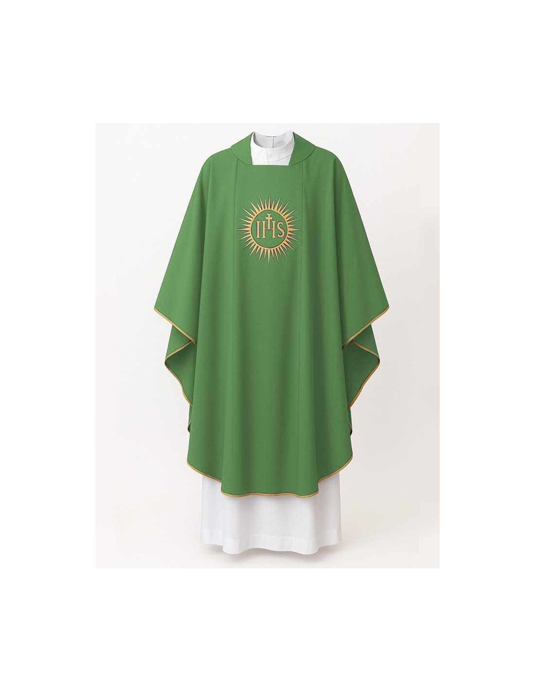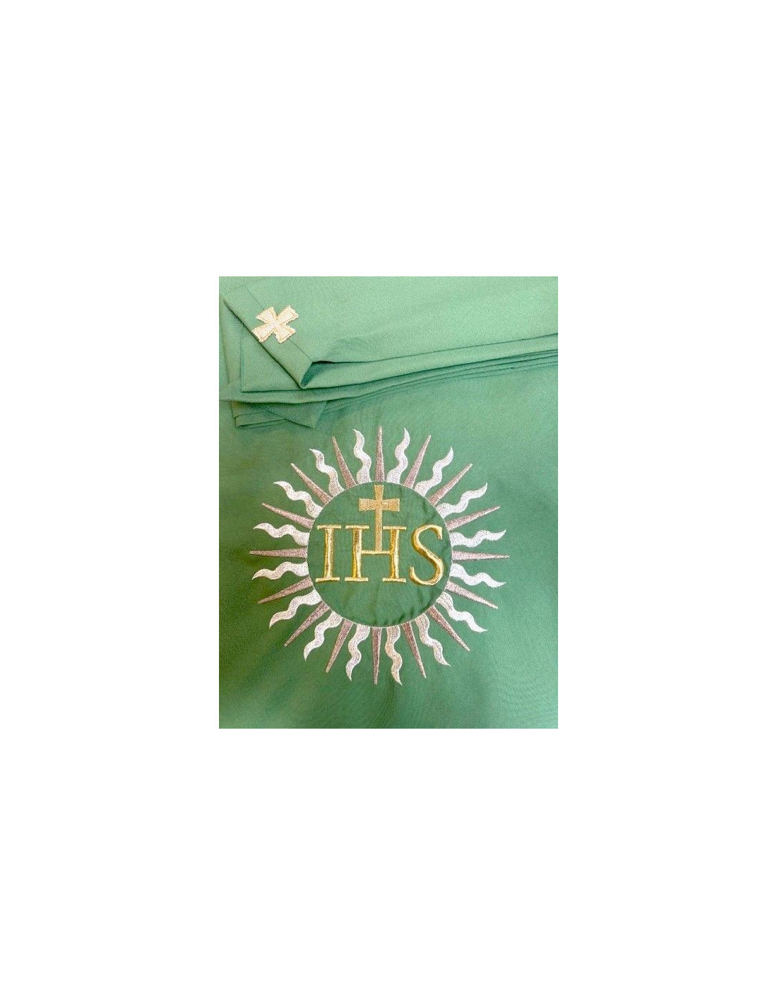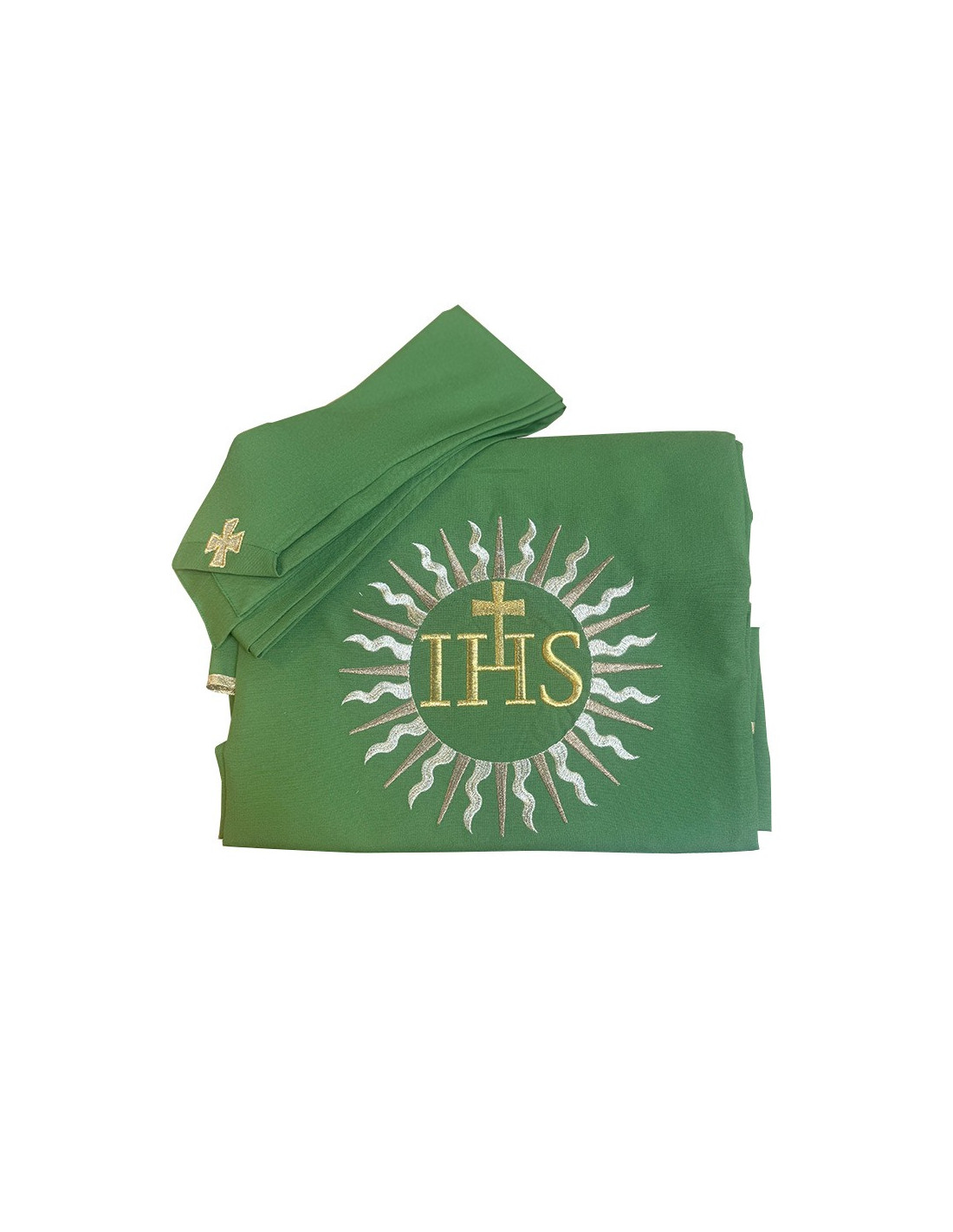 Casula liturgica verde ricamata sul davanti e sul retro con un motivo stilizzato di sole raggiante con il monogramma JHS, in filo dorato.
