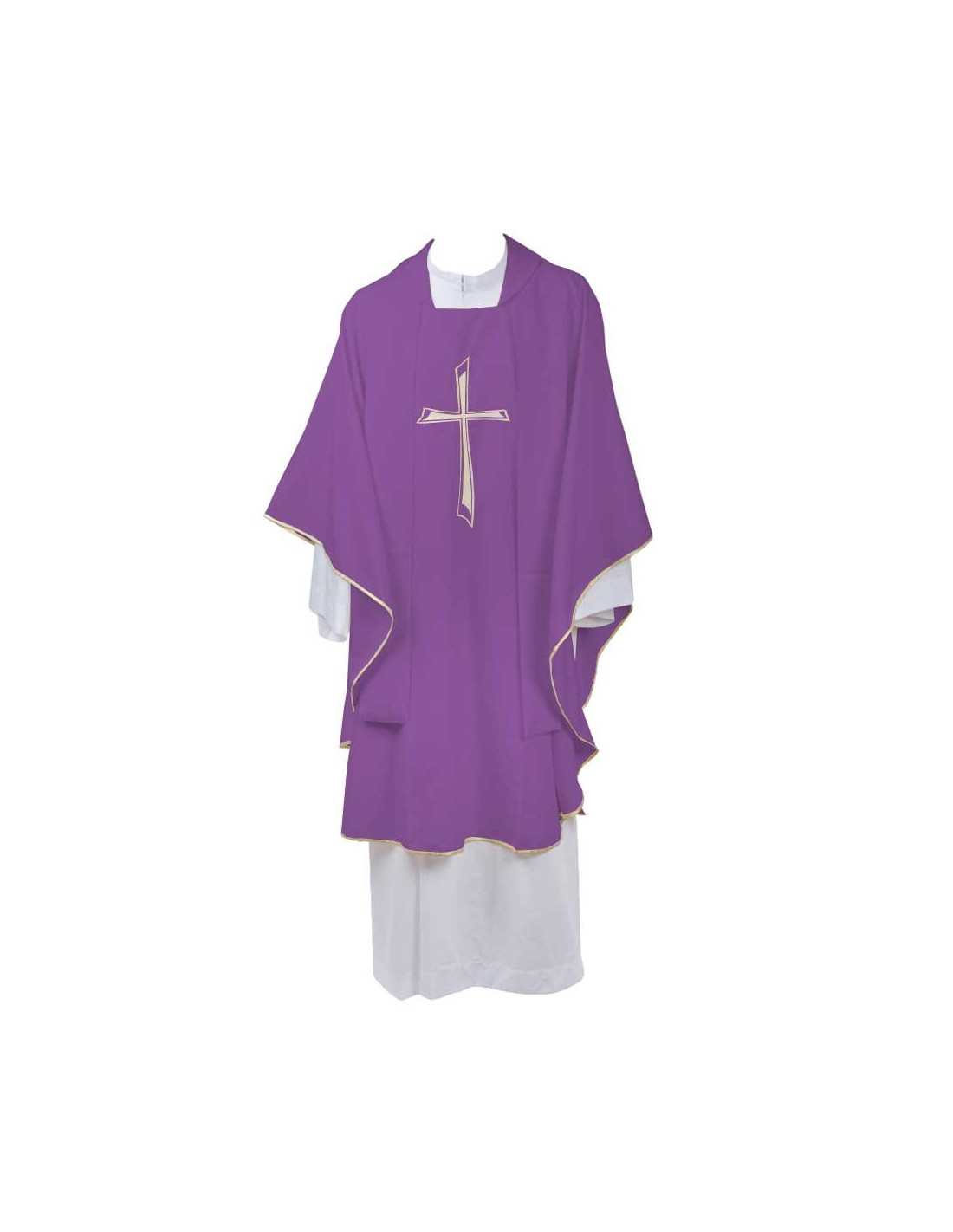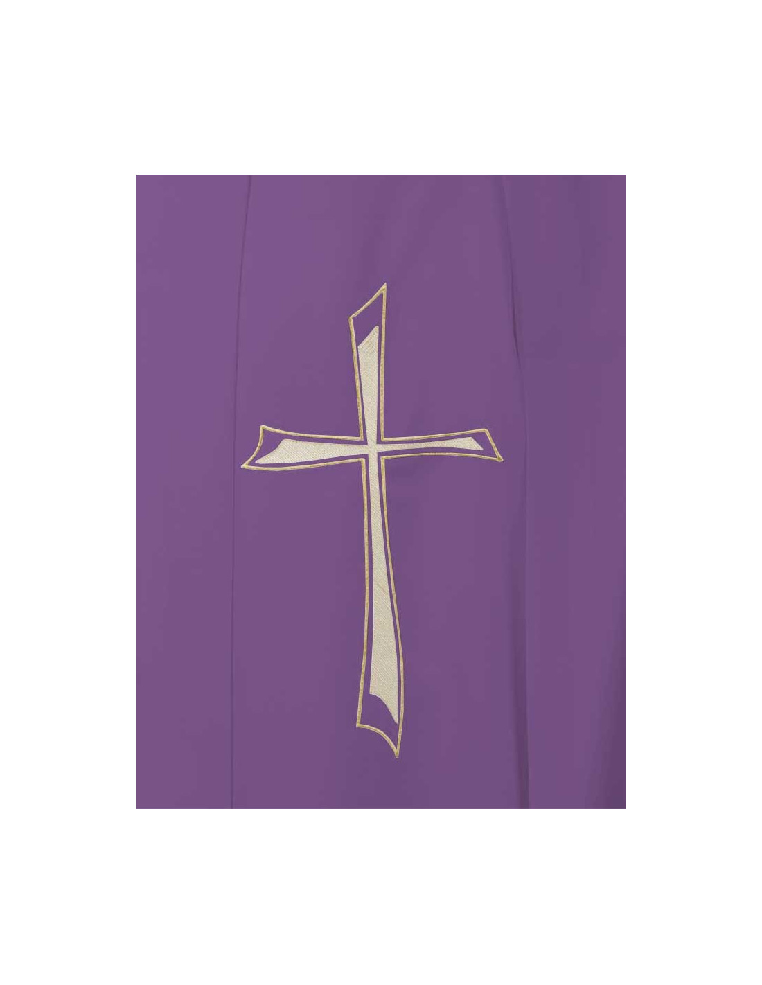 Casula liturgica ricamata sul davanti e sul retro con un motivo a croce TAU stilizzata in filo d'oro. La stola coordinata è ornata da una piccola e discreta croce dorata al centro del collo. Il viola è un colore che rappresenta l'attesa e il perdono. È un colore indossato dai sacerdoti durante l'Avvento e la Quaresima.