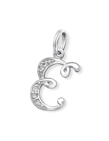 Ciondolo in vero argento 925 e intarsiato con cristalli. Il ciondolo prende la forma della lettera E, splendidamente scritta a mano in calligrafia.
