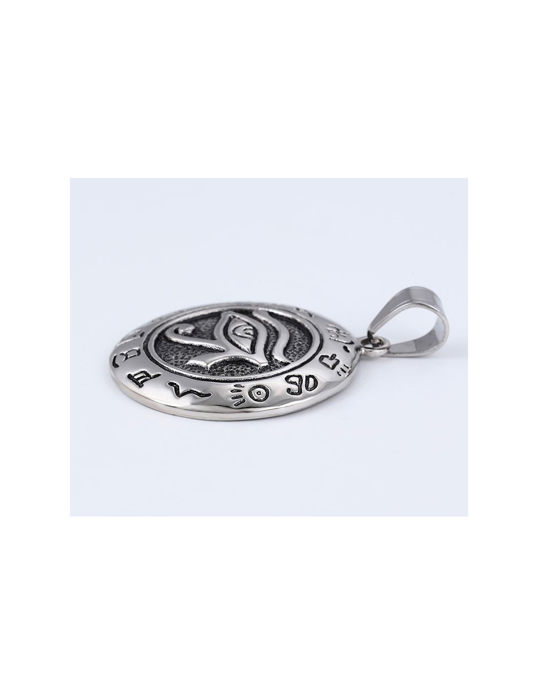 Ciondolo d'argento in acciaio inossidabile con il simbolo dell'Occhio di Ra e circondato da vari altri glifi. L'Occhio di Ra, da non confondere con l'Occhio di Horus, è una maschera solare e molto potente, che protegge chi la indossa.