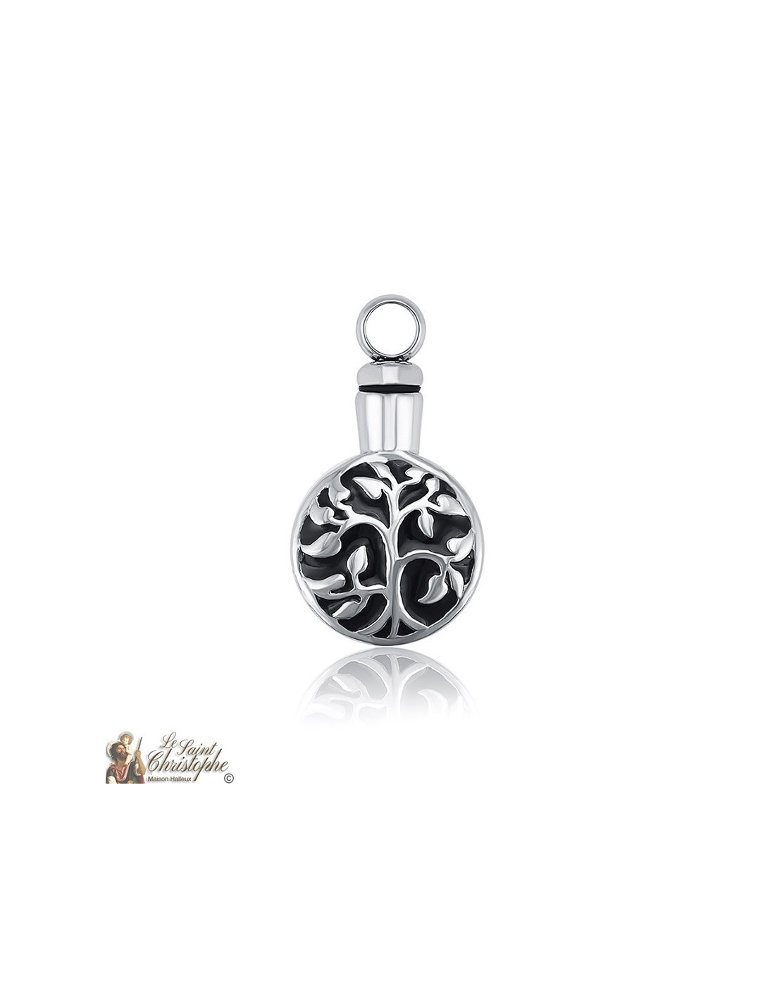 Ciondolo cinerario in acciaio inossidabile, per contenere le ceneri funerarie. Questo modello ha la forma di un albero finemente lavorato, con uno sfondo nero per evidenziarlo.