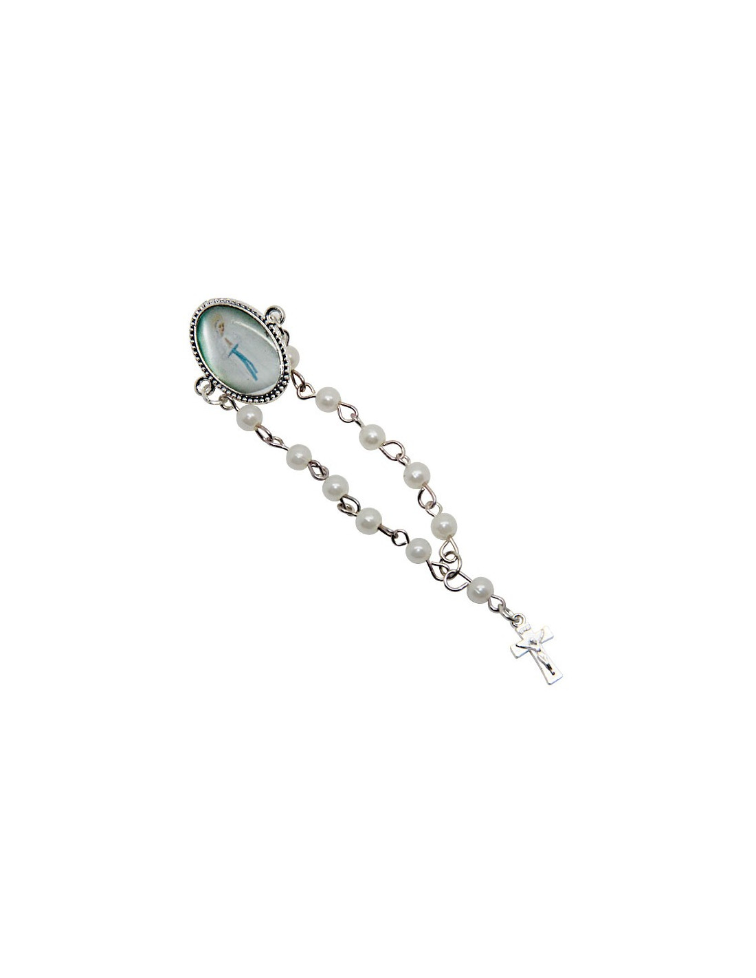 Spilla da rosario della Vergine dei Poveri di Banneux Notre Dame. Questa spilla di perline con ciondolo a croce è un piccolo rosario, circa dieci, in metallo argentato e perline bianche.