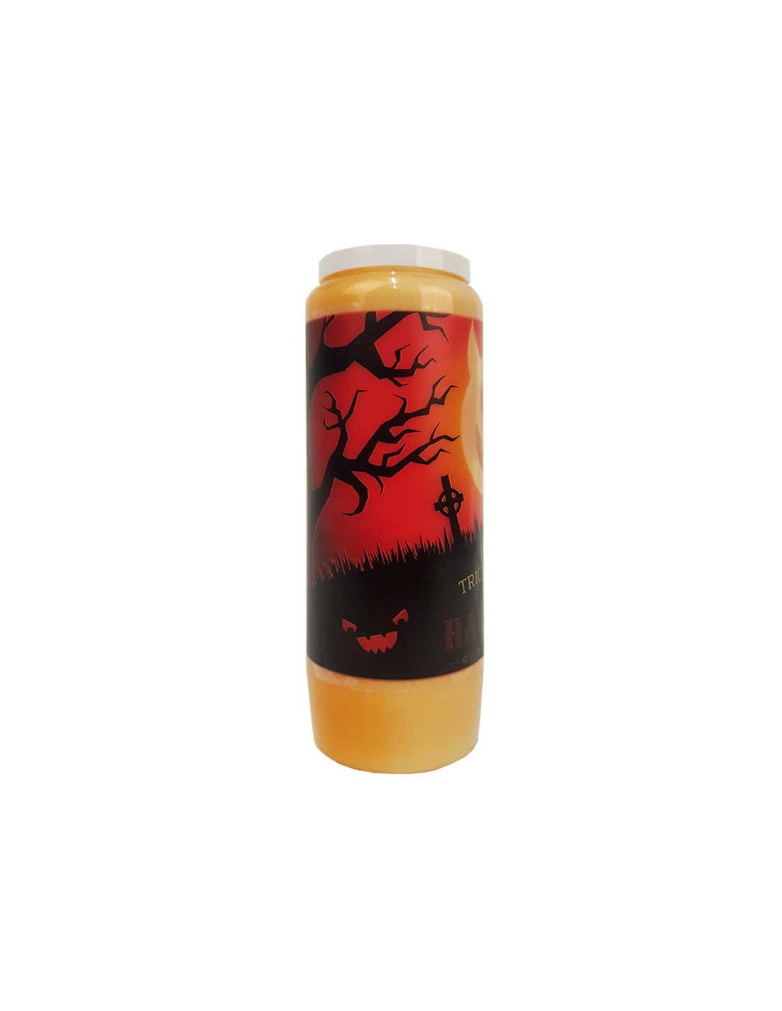 Candele di novena al profumo di cannella all'arancia con una speciale illustrazione di Halloween. L'immagine è trasparente per un effetto fotoforo.
