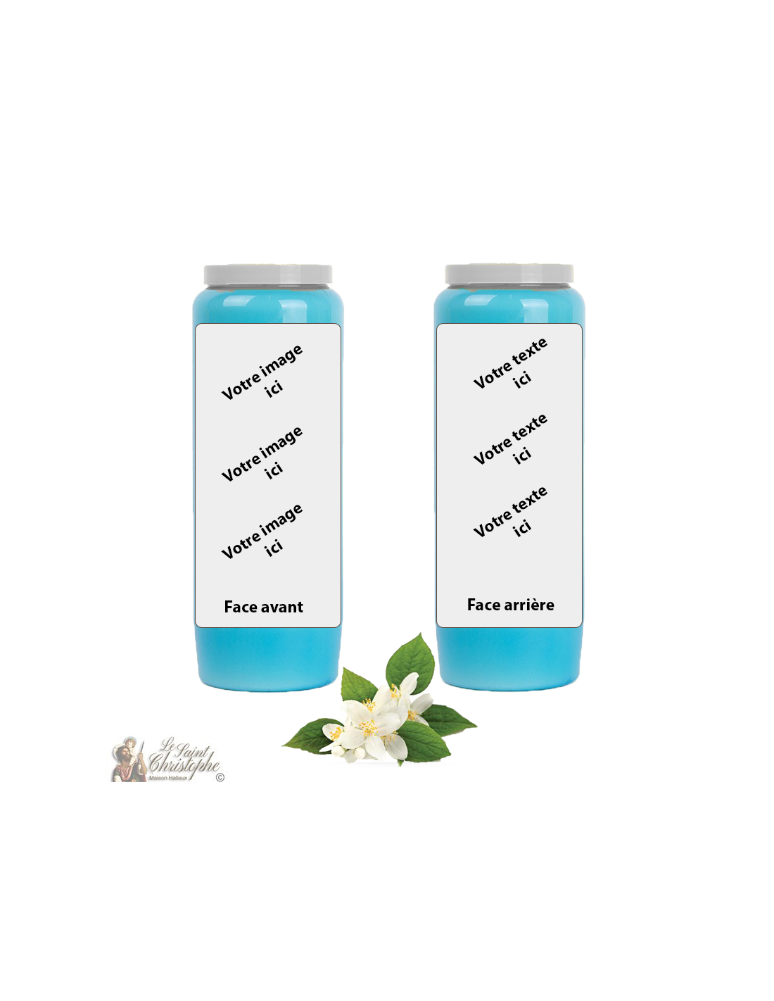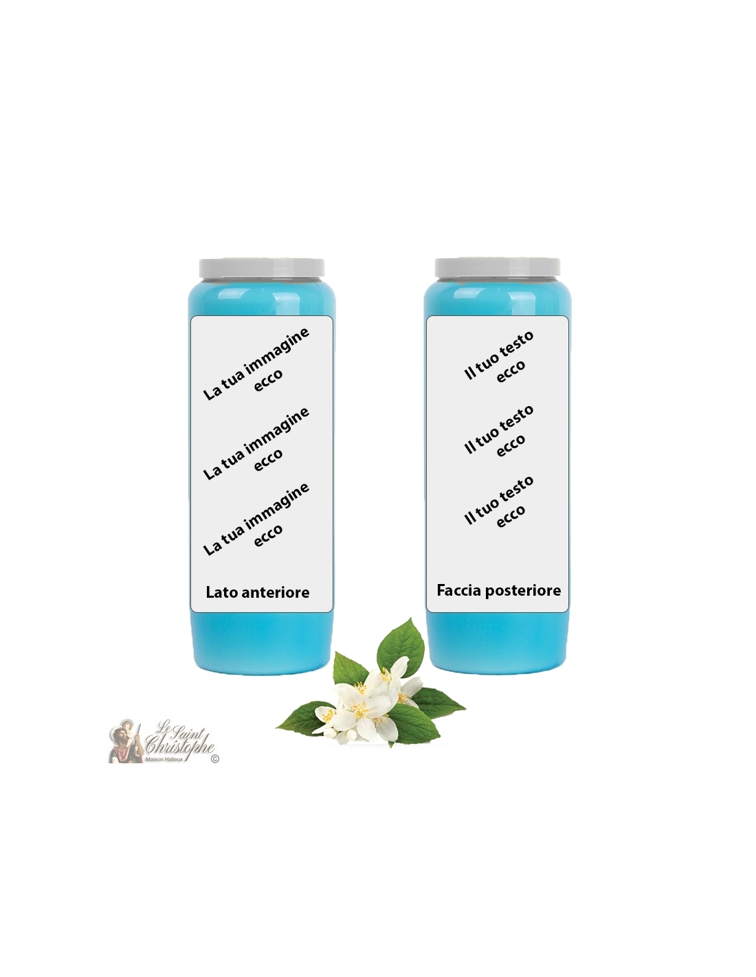 Candela di novena azzurra con olio vegetale profumato al gelsomino e iris, personalizzabile con la vostra immagine e testo. La miscela gelsomino-iris porta calma e una migliore qualità dell'aria.