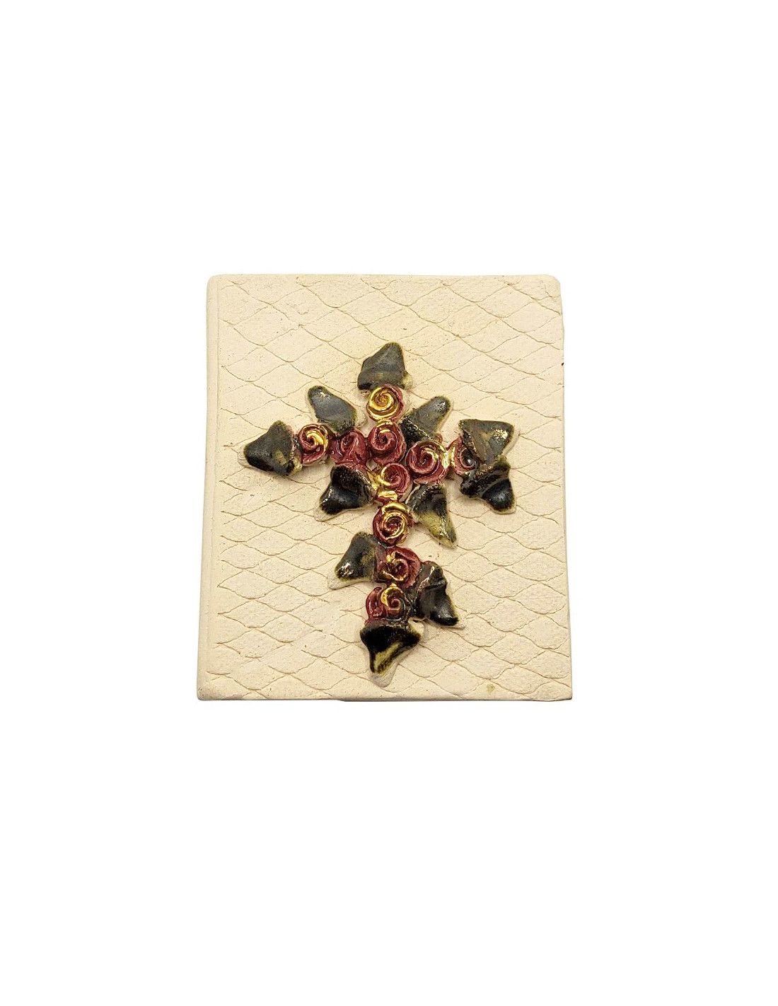 Scatola e dieci grani del rosario realizzati interamente a mano in terracotta. La scatola ha la forma di una Bibbia decorata con una croce formata da foglie e rose rosse con doratura. All'interno, i dieci rosari con croce decorata con le stesse foglie e rose della copertina della Bibbia.