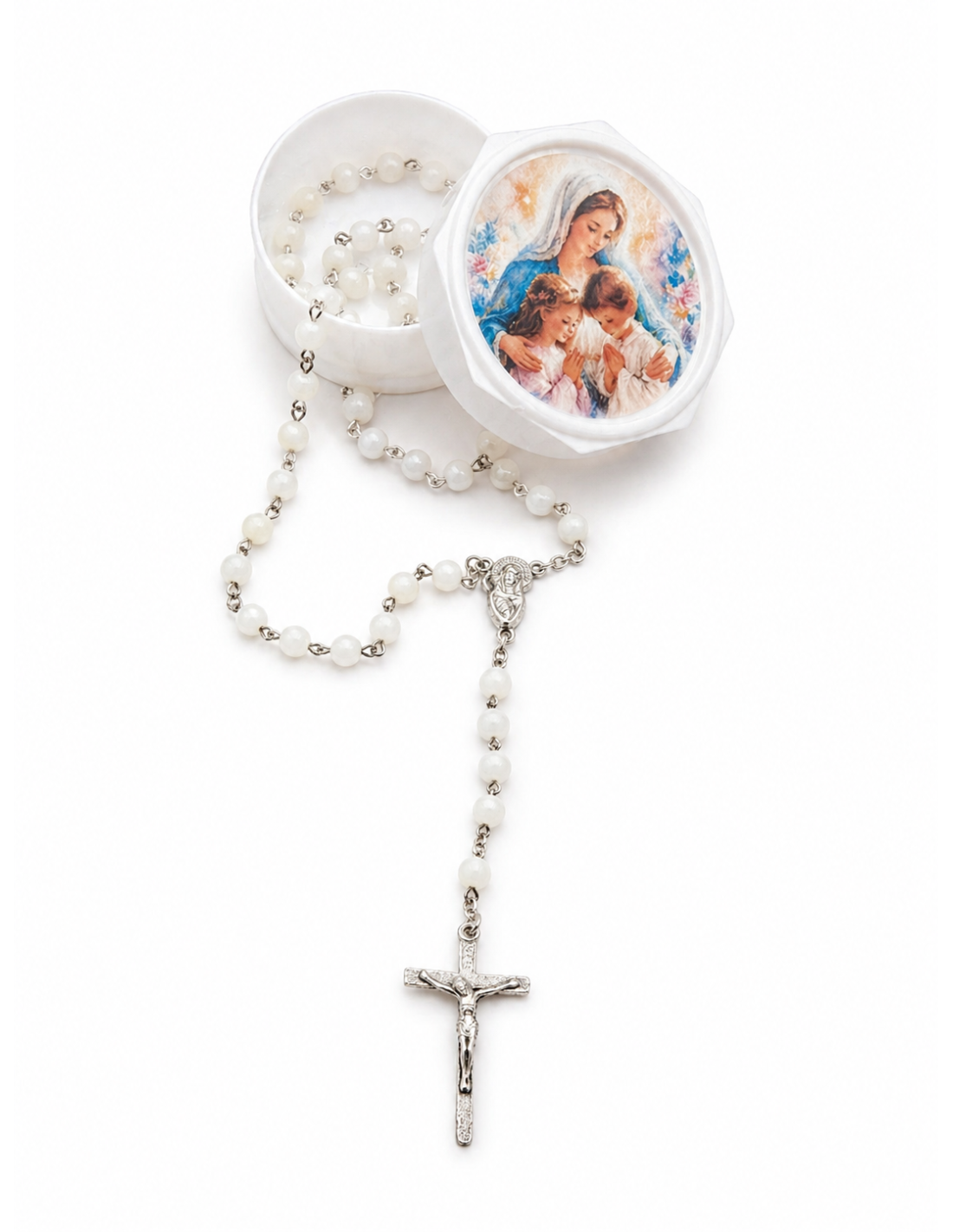 Un rosario semplice ed elegante, con perle luminose che esprimono purezza, fede e protezione.