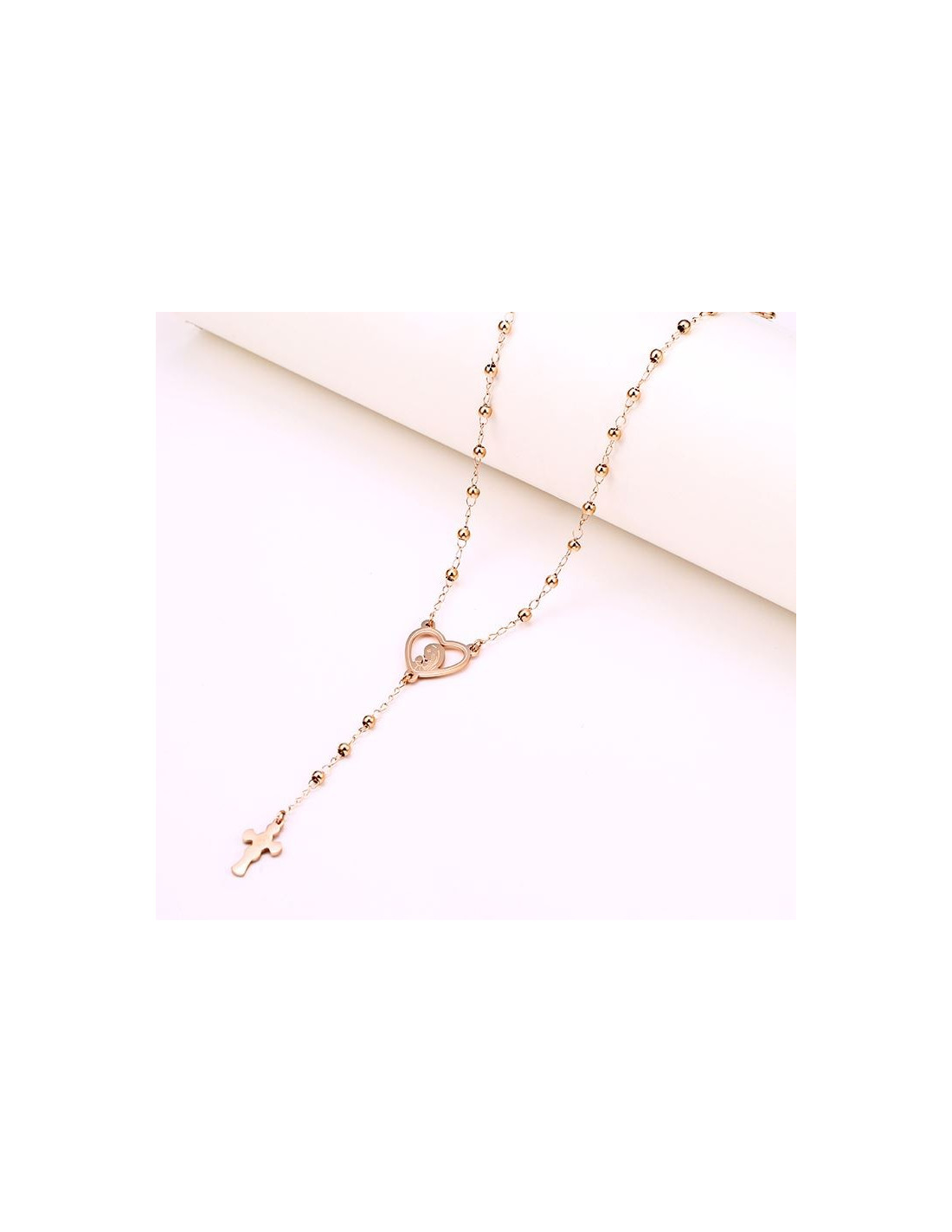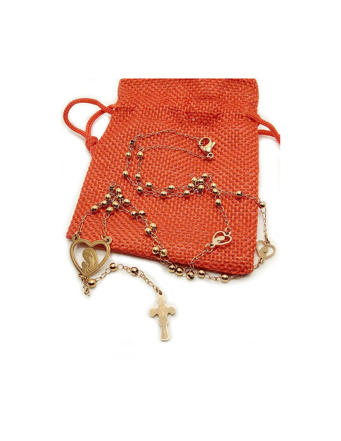 Questo rosario di un bellissimo oro rosa è un gioiello discreto che testimonia silenziosamente la fede mentre porta un tocco luminoso e morbido. Il suo centrotavola a forma di cuore presenta una figura che prega a mani giunte.