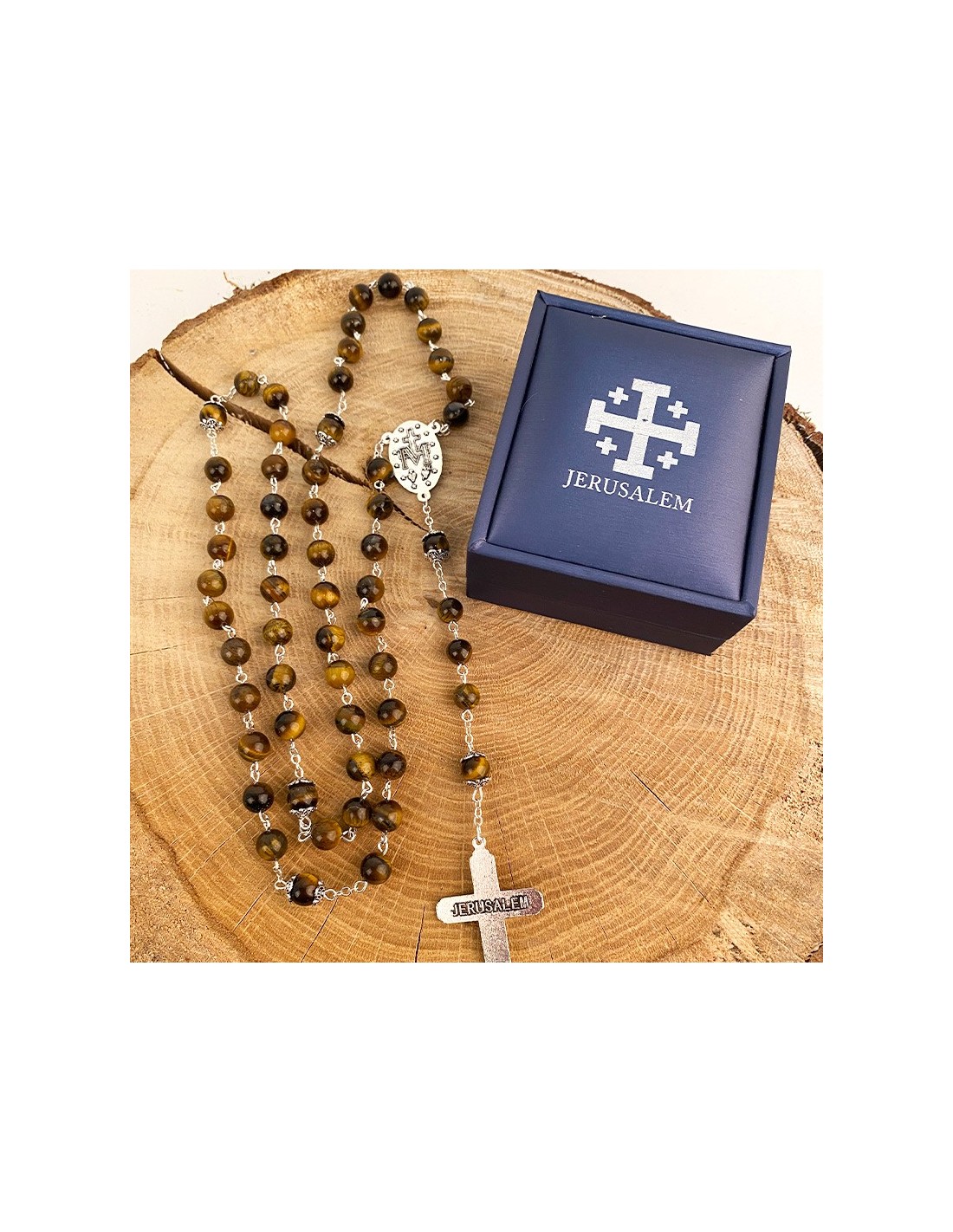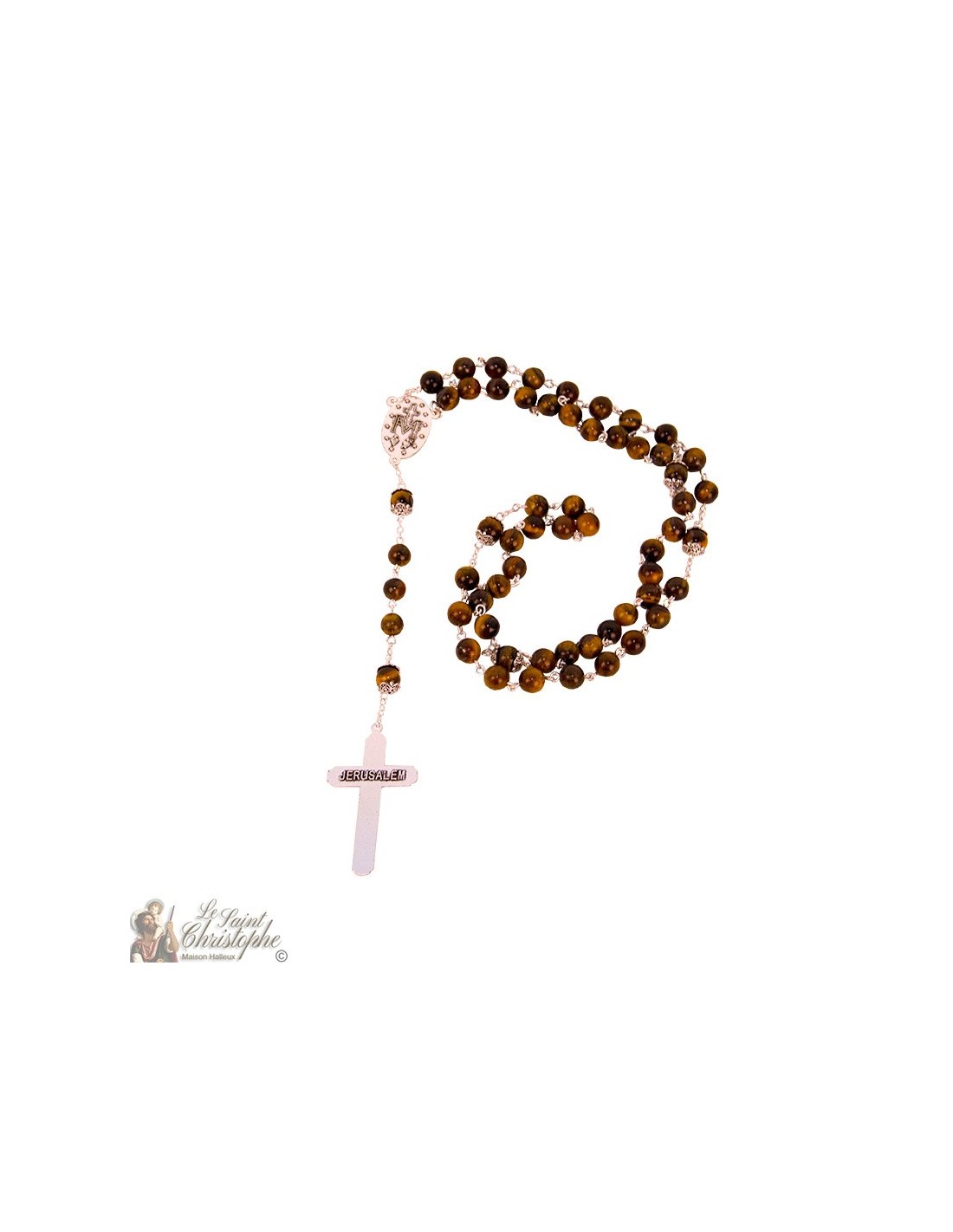 Rosario montato su catena in metallo argentato con perline a occhio di tigre. Pietra fine e delicata, l'occhio di tigre è un minerale dai colori bruni e ocra e dai magnifici riflessi giallo fiammeggianti. La medaglia centrale del rosario è dedicata alla Vergine Miracolosa con le parole "O Maria, concepita senza peccato, prega per noi che ricorriamo a te". Sul retro della medaglia è impresso un simbolo mariano. La croce finemente scolpita con le fattezze di Gesù, pendente di questo rosario, è incisa sul retro con la menzione di Gerusalemme. È conservato in una bella scatola all'interno di velluto nero.