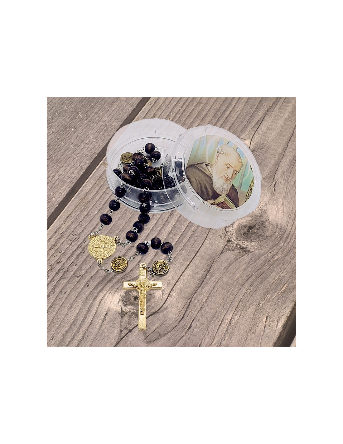 Rosario in legno marrone con catena in metallo argentato. Le perle e il pendente sono in metallo dorato e si sposano bene con il marrone del legno. Sui grani è impressa l'immagine della medaglia di San Benedetto, potente simbolo cristiano di protezione.