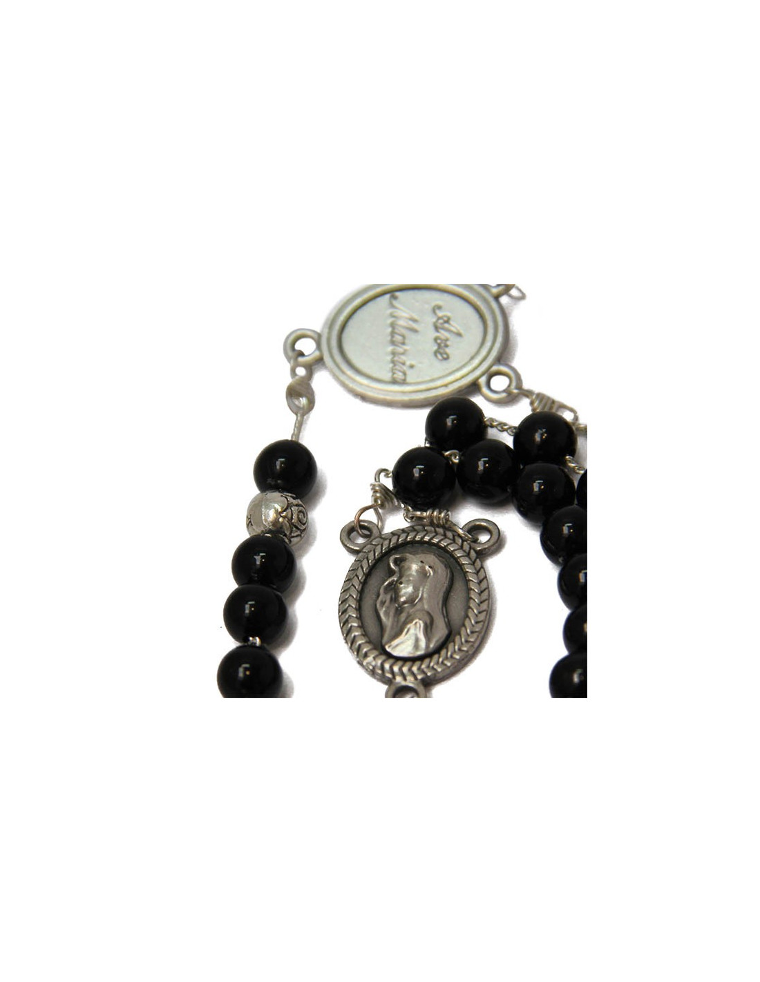 Scopri il nostro raffinato rosario con perle in resina nera, montato su una catena in metallo argentato. È impreziosito da una medaglia della Vergine Maria con l’incisione "Ave Maria" sul retro. Il ciondolo a croce, finemente cesellato, aggiunge un tocco di eleganza e spiritualità. La catena si chiude facilmente grazie a una pratica chiusura.
