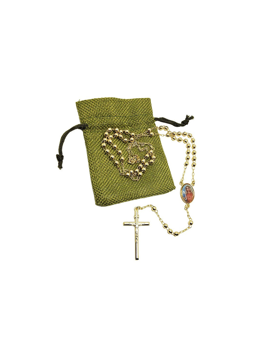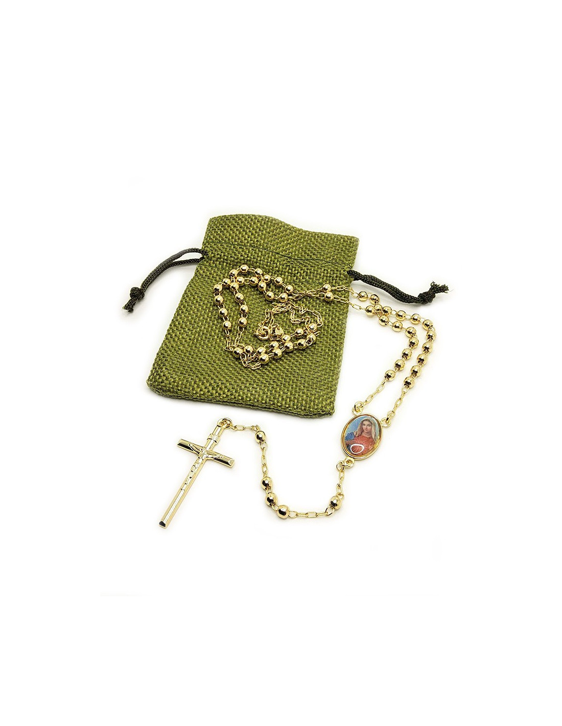 Rosario del Sacro Cuore di Maria placcato oro 14 carati, con chiusura a moschettone per l'aggancio come collana. La medaglia centrale del Sacro Cuore di Maria è a colori, con una croce incisa sul retro. Venduto con un astuccio per la conservazione.