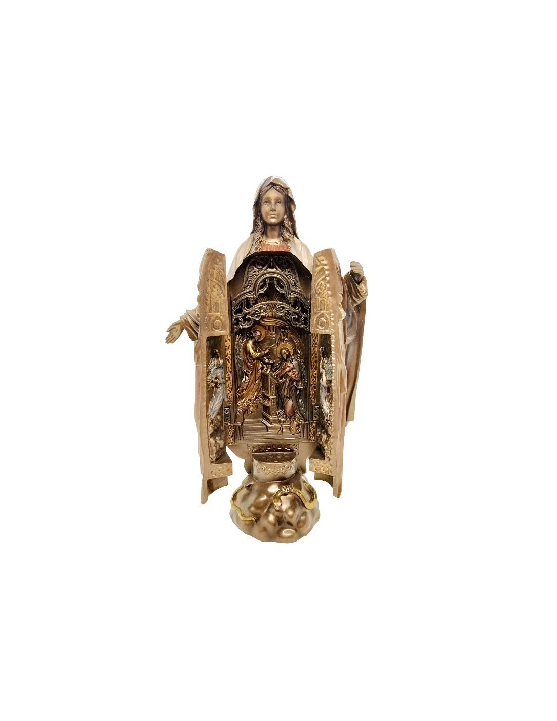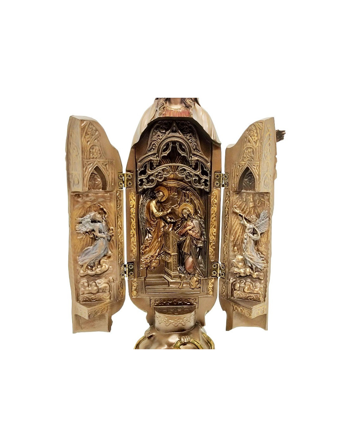 L'interno è scolpito per rappresentare una scena dell'Annunciazione, la statua si apre frontalmente e le porte a battente sono ciascuna scolpita con un angelo sulla faccia interna.
