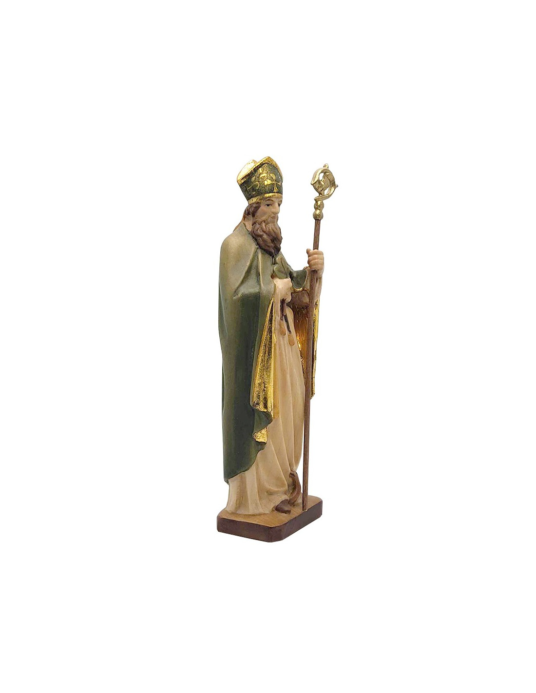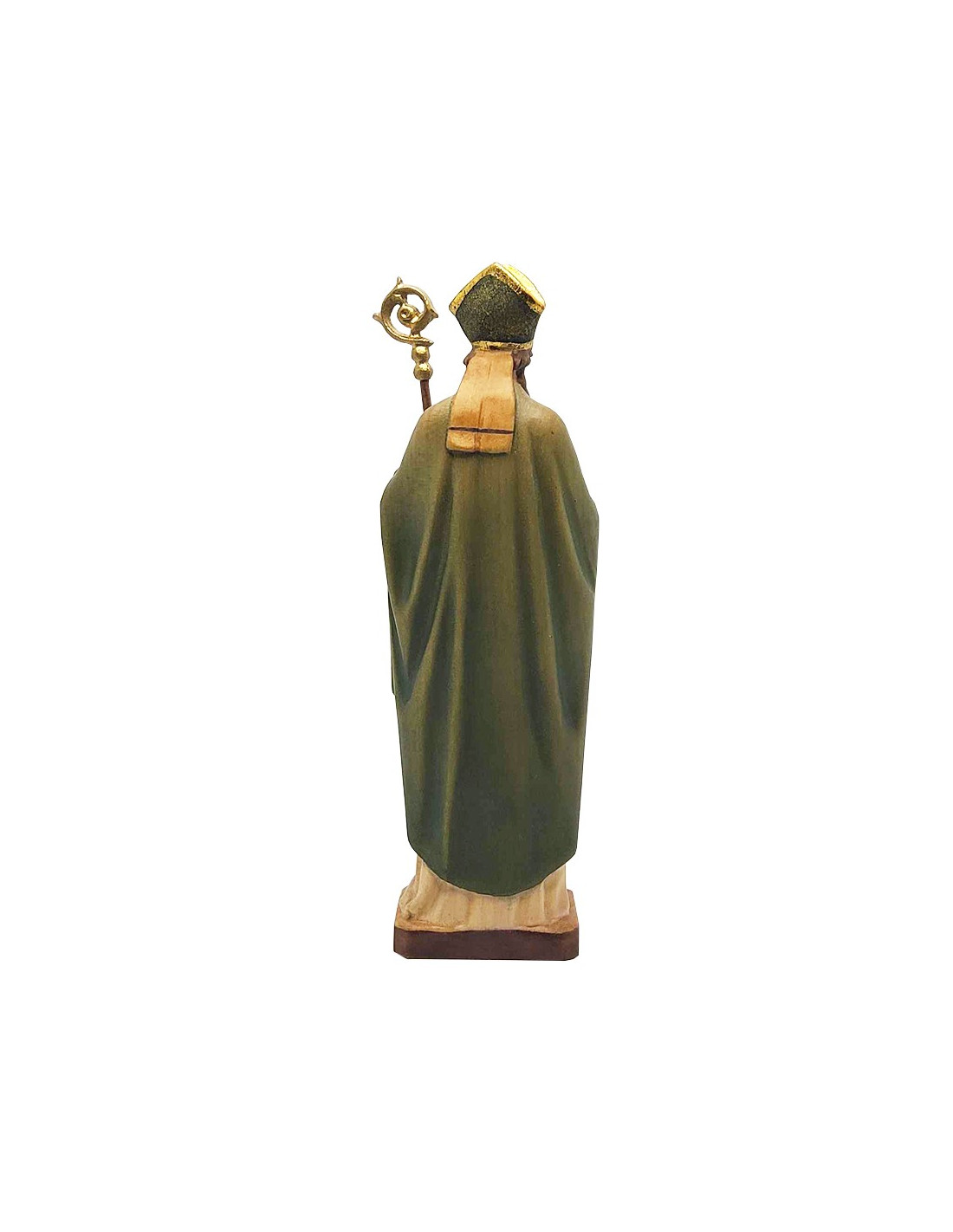 Statua di San Patrizio, o Saint Patrick, realizzata artigianalmente in legno, scolpita e dipinta a mano. Le delicate finiture di questa statua sono dettagliate e danno vita al personaggio. San Patrizio è raffigurato vestito da vescovo, con mitra e pastorale, il tutto nei toni del verde. Tiene un trifoglio sul cuore. L'interno del mantello, le decorazioni della mitra e la sommità del pastorale sono dipinti in oro, esaltando i colori della figura sacra.