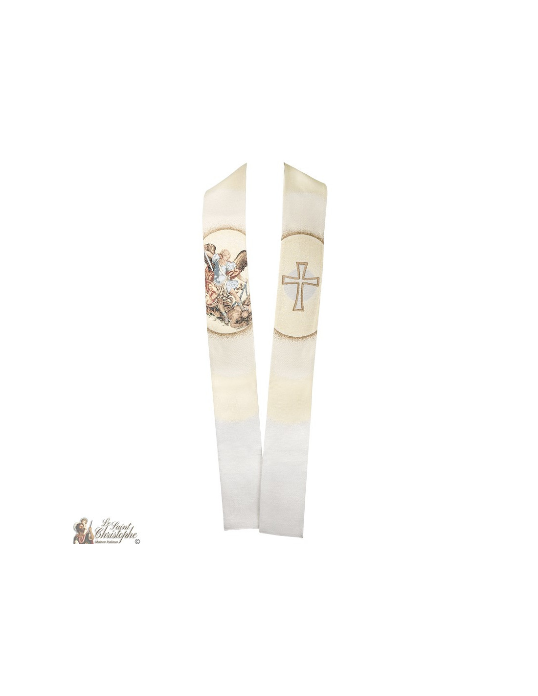 Questa stola da prete è intessuta con l'immagine dell'Arcangelo San Michele e un fiore di croce. Il fondo beige crema ha una delicata gradazione. L'intreccio è un vero e proprio ricamo ad arazzo con una finitura ammirevole, ispirato agli arazzi di Bruges.