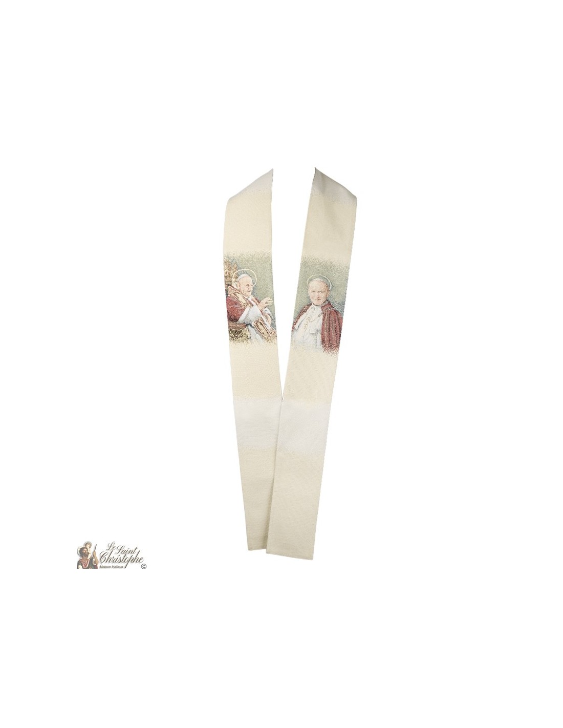 Questa stola da prete è tessuta con l'immagine dei Papi San Giovanni XXIII e San Giovanni Paolo II. Lo sfondo beige crema ha una delicata gradazione. La trama è un vero e proprio arazzo ricamato con una finitura ammirevole, ispirato agli arazzi di Bruges.