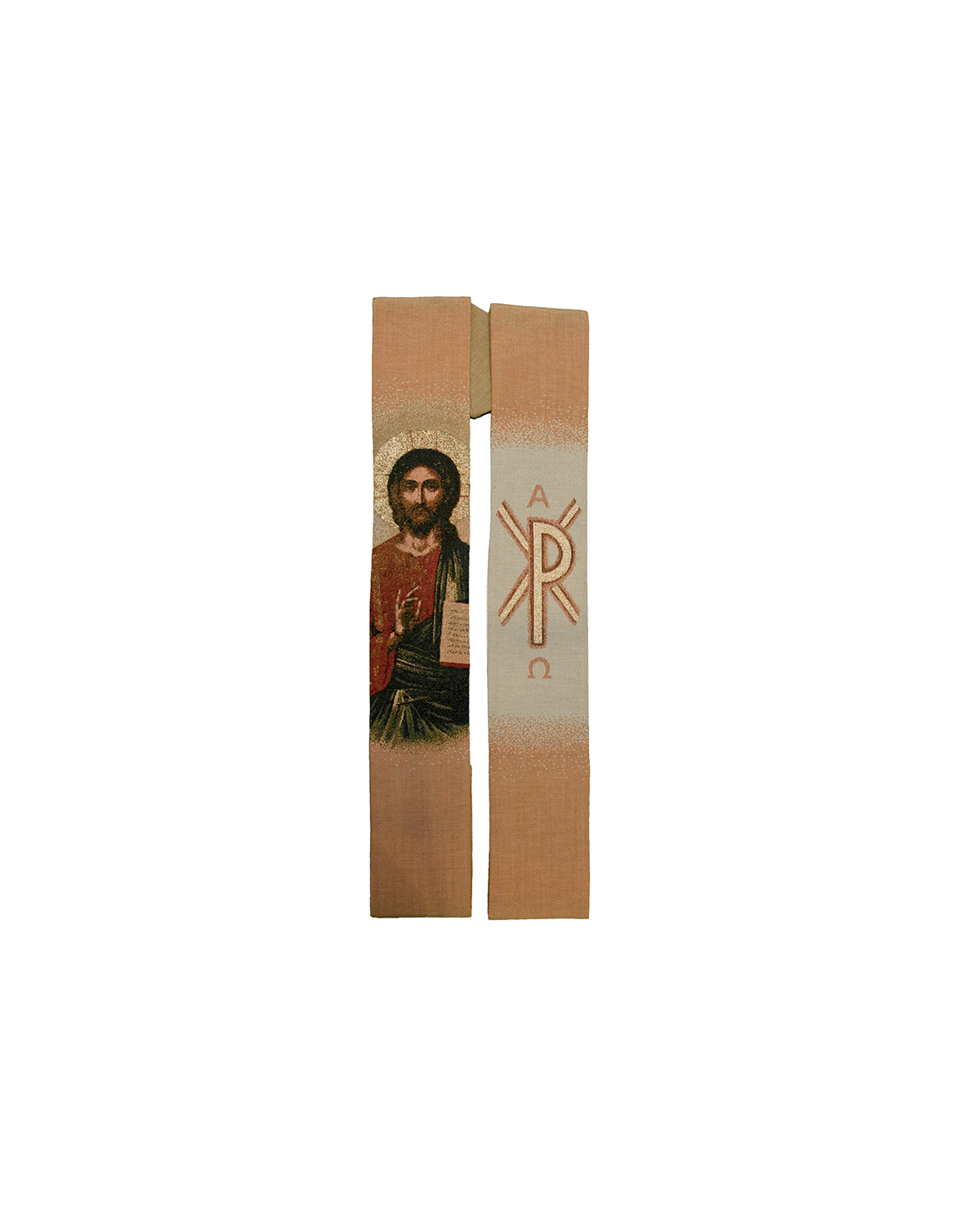 Questa stola da prete è intessuta con un'icona di Cristo e i simboli PAX, alfa e omega. Il fondo beige ha una delicata gradazione. L'intreccio è un vero e proprio ricamo ad arazzo con una finitura ammirevole, ispirato agli arazzi di Bruges.
