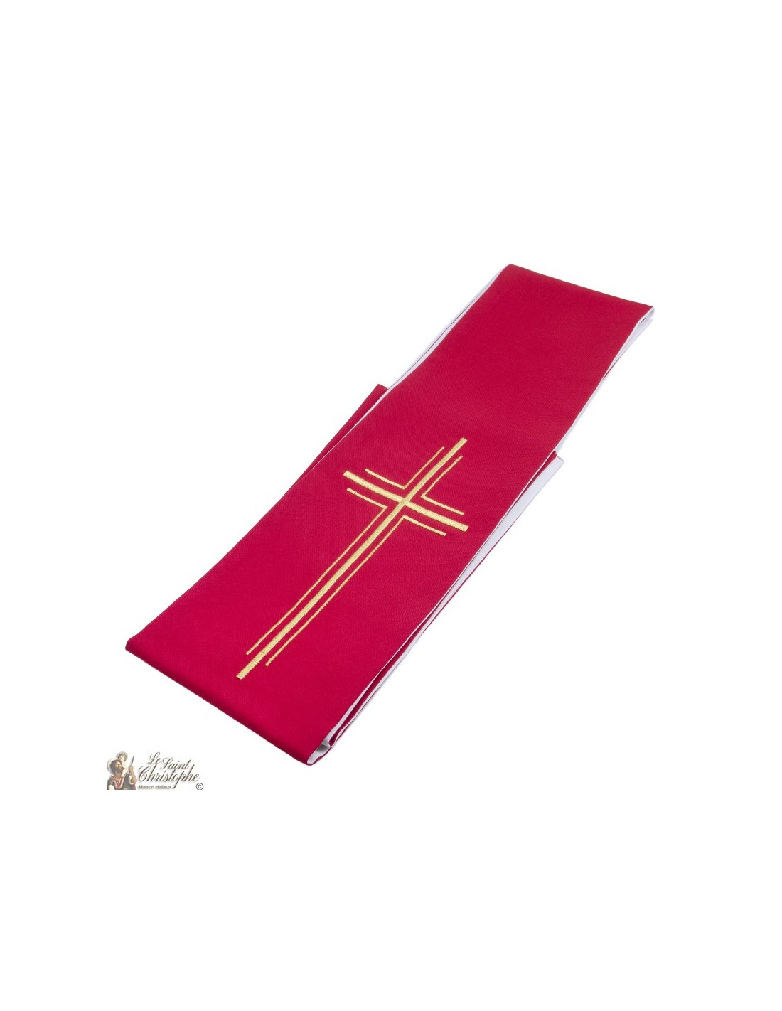 Questa stola da sacerdote bicolore è double-face o reversibile. Un lato è bianco, l'altro rosso. Entrambi i lati sono ricamati con filo d'oro, quattro ricami identici. Il disegno è una croce con bordo in stile moderno e semplice.
