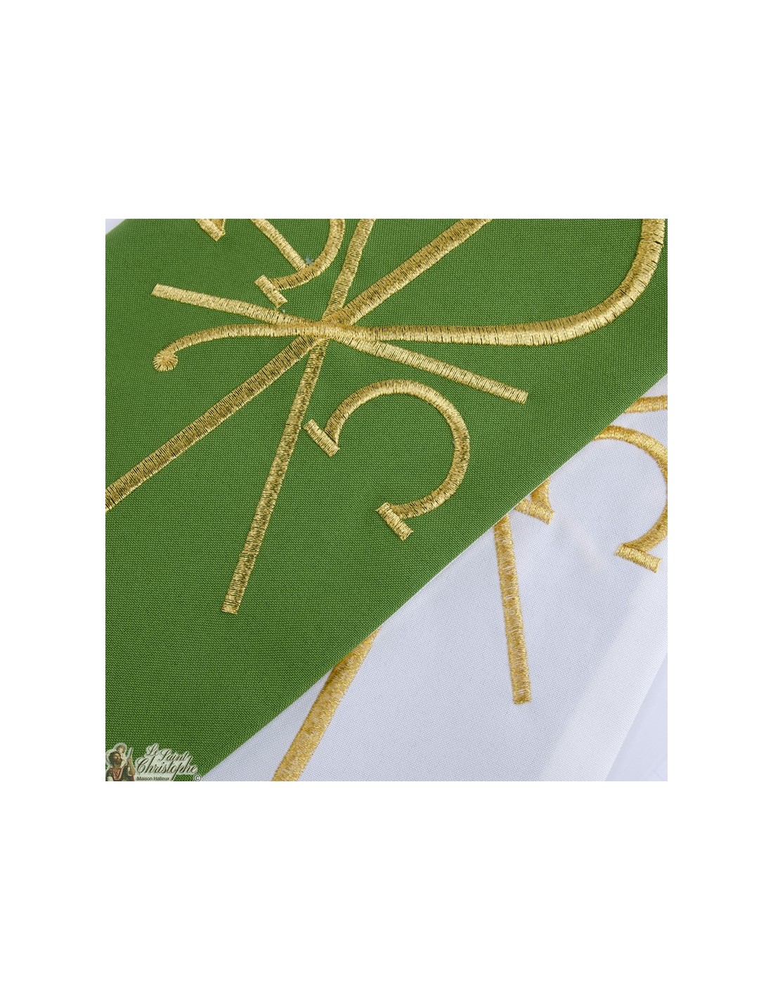 Questa stola da sacerdote bicolore è double-face o reversibile. Un lato è bianco, l'altro verde. Entrambi i lati sono ricamati con filo d'oro, quattro ricami identici. Il motivo rappresenta il simbolo PAX alfa e omega.