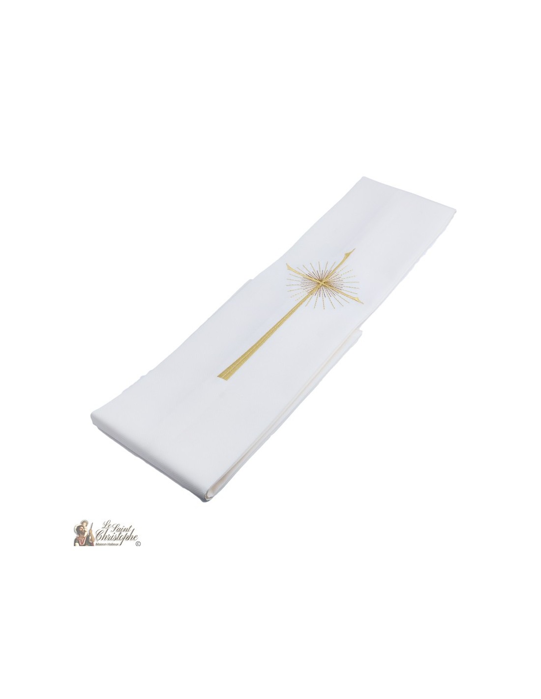 Stola da prete color crema e ricamata. Interamente realizzata a mano, la stola è facile da curare e lavabile in lavatrice. Il ricamo in fili d'oro e marrone ramato, rappresenta una croce moderna e fine, molto elegante, aureolata da raggi luminosi.