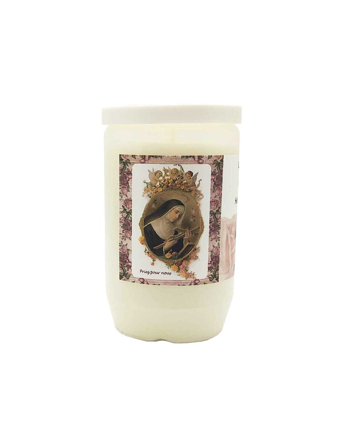 De witte kunststof houder is stevig en praktisch, beschermt de vlam en benadrukt de religieuze afbeelding terwijl hij een rustgevend licht verspreidt.