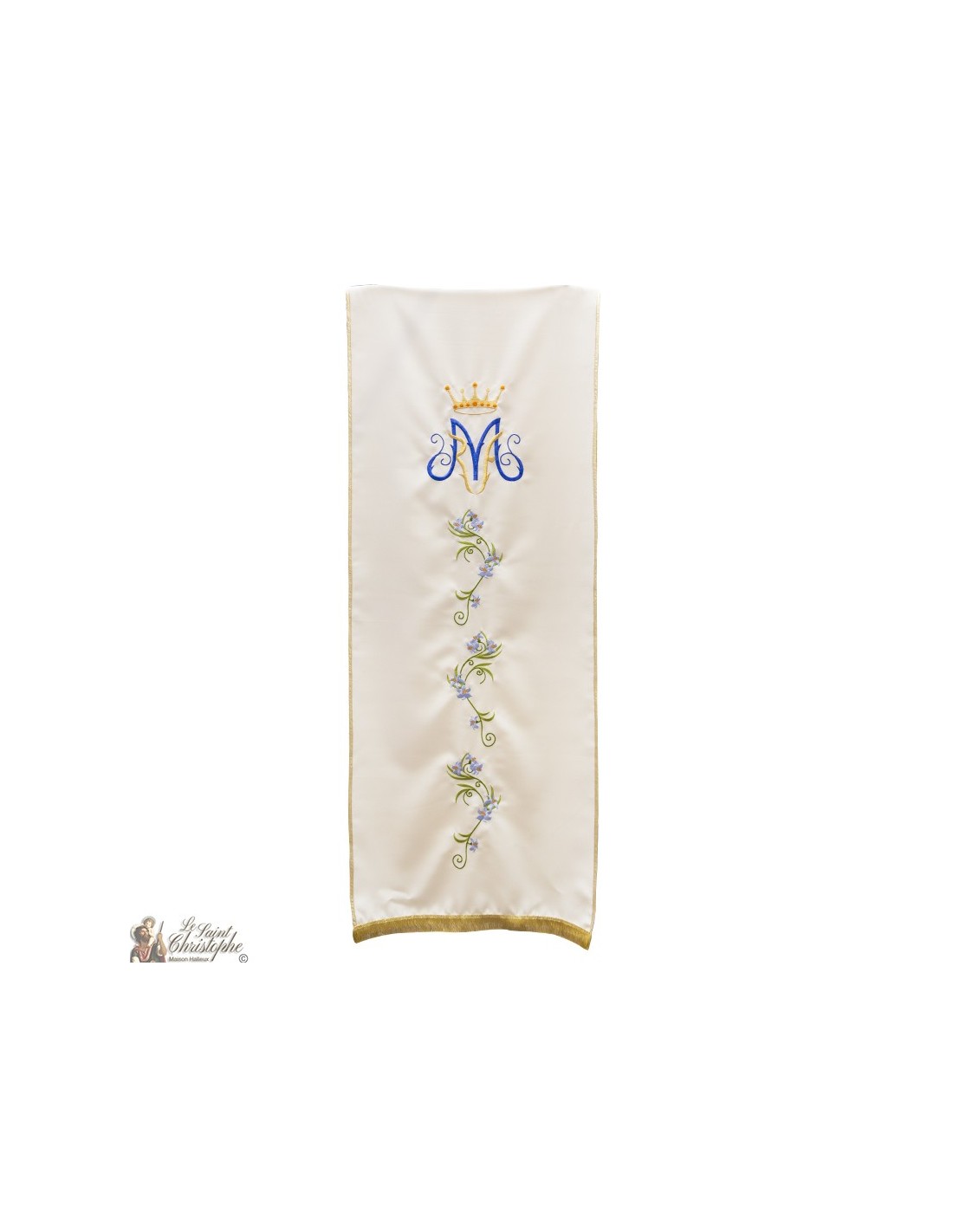 Lecternesluier met mariaal symbool in het midden. Het symbool is een koningsblauwe M, omgeven door plantenmotieven en bekroond met een vijfpuntige oranje en gouden kroon. De rand van de lessenaarssluier is geborduurd met gouddraad en de onderrand heeft een iets langere franje. De kleur van de sluier zelf is beige-crème. Groentemotieven versieren de sluier onder het Maria-symbool.