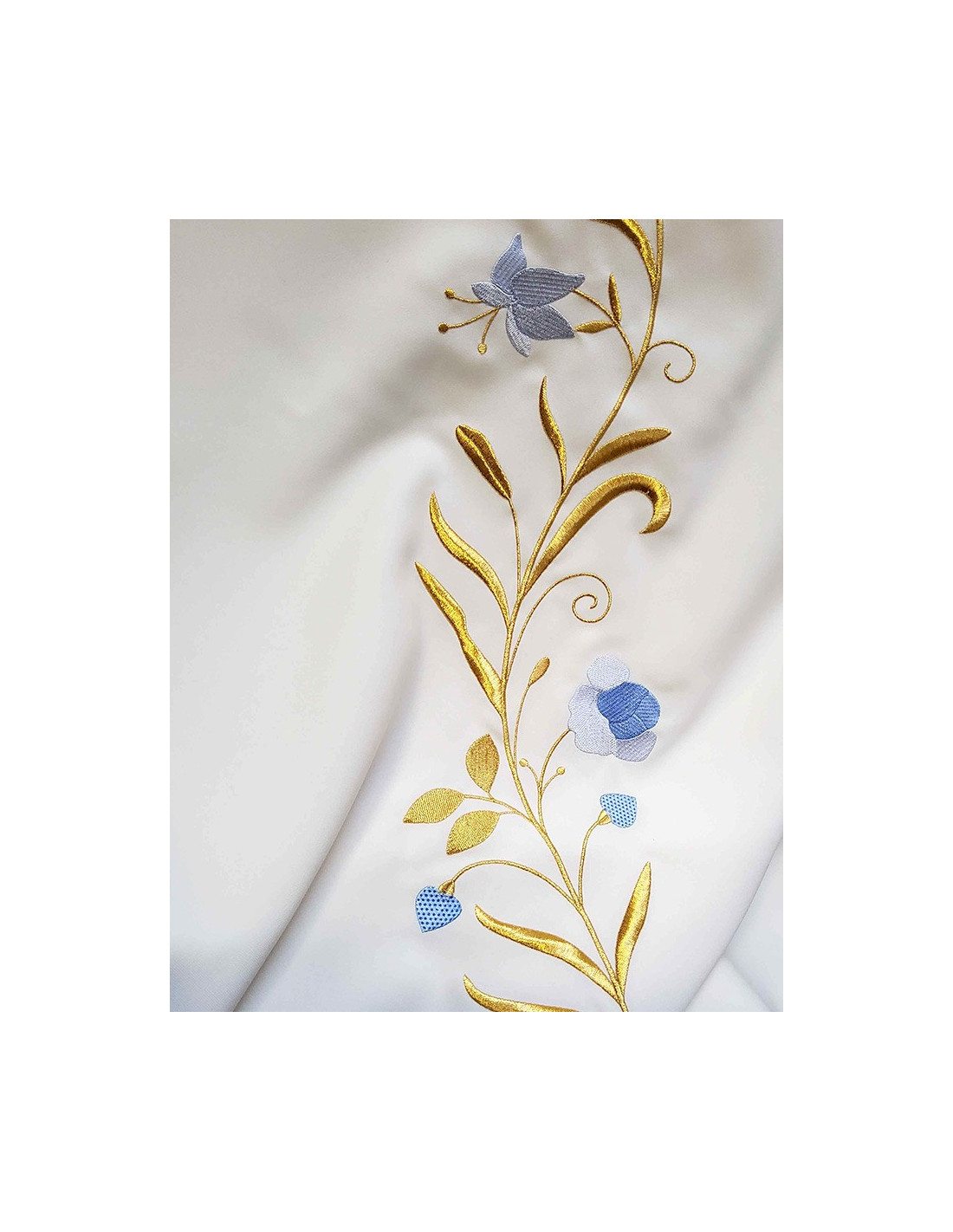 Borduurwerk: gouddraad en blauwe bloemmotieven