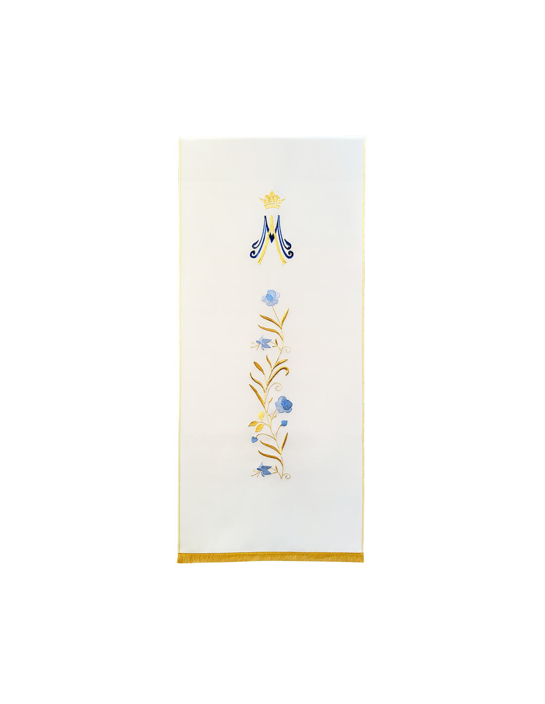 Prachtige lezenaarssluier, gemaakt van hoogwaardig polyester en versierd met fijne gouddraadborduursels die het gekroonde Mariamonogram voorstellen.