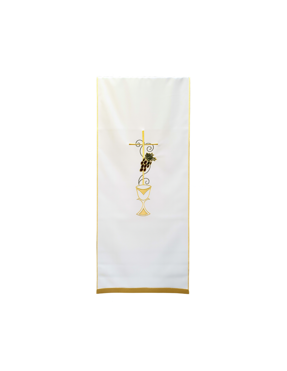 Dit liturgisch doek symboliseert zowel de Eucharistie als de wijnstok van de Heer, en herinnert aan het offer van Christus en de gemeenschap van de gelovigen.
