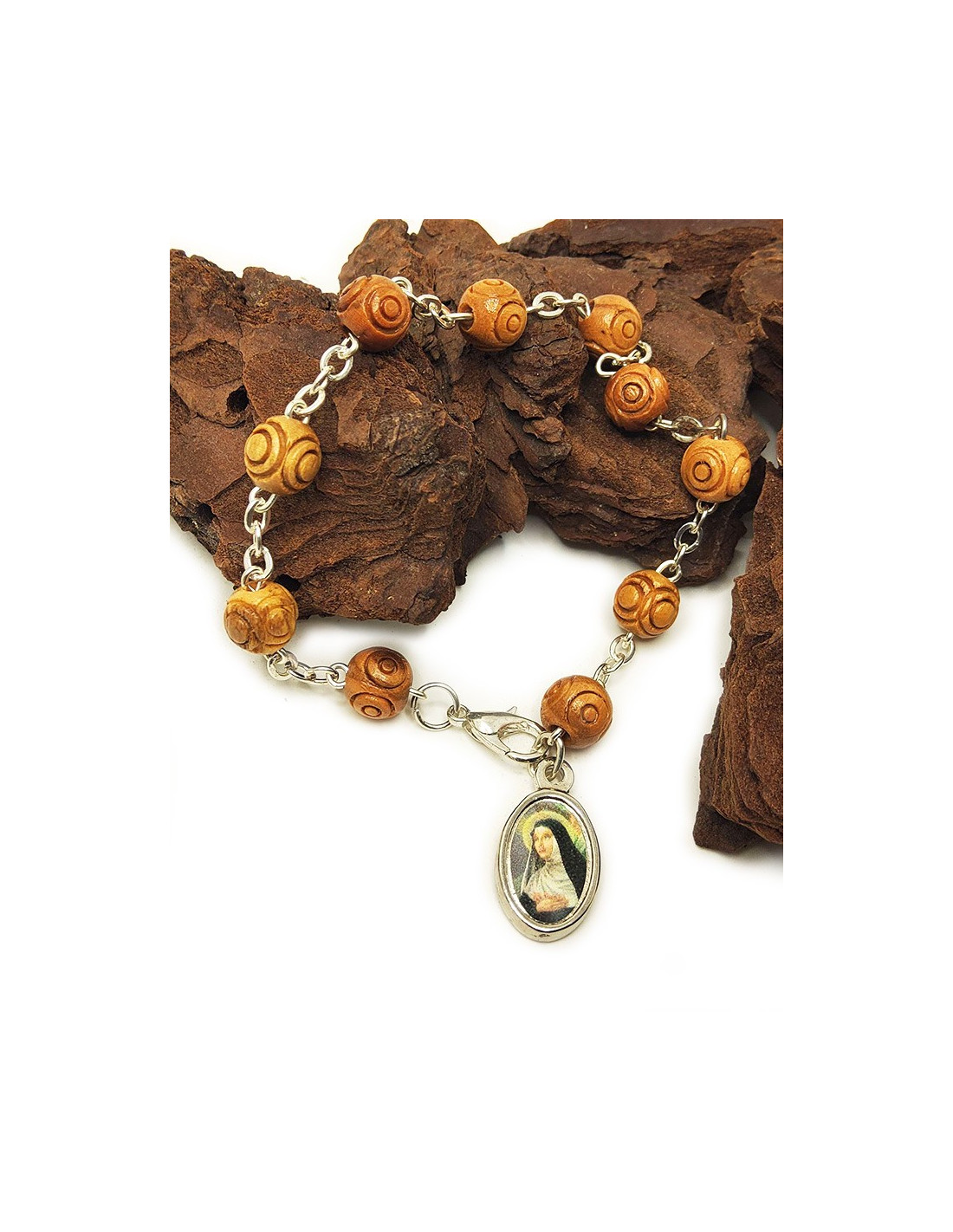 Armband die dankzij de 10 houten kralen en de medaille als rozenkrans kan worden gebruikt. De houten kralen zijn gemonteerd op een zilverkleurige fantasieketen en zijn voorzien van concentrische cirkels. De medaille is versierd met de portretten van Sainte Rita en Padre Pio.