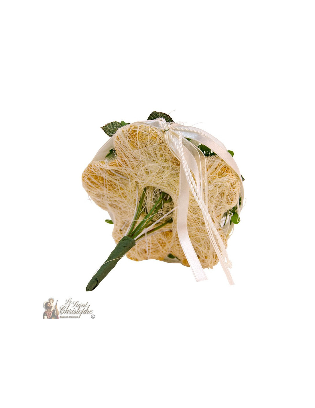 De achterkant van het boeket heeft de vorm van een bloem met beige draden. Het is omgeven door witte linten en koorden. Het midden van het boeket is versierd met een wit pluchen hart.