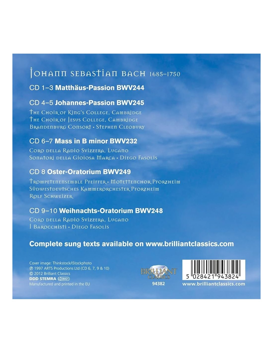Verzamelbox met 10 audio-cd's met heilige muziek gecomponeerd door Johann Sebastian Bach. Geniet van de koormeesterwerken van de Matthäus-Passion, Johannes-Passion, Mis in B mineur, Oster-Oratorium en Weihnachts-Oratorium.