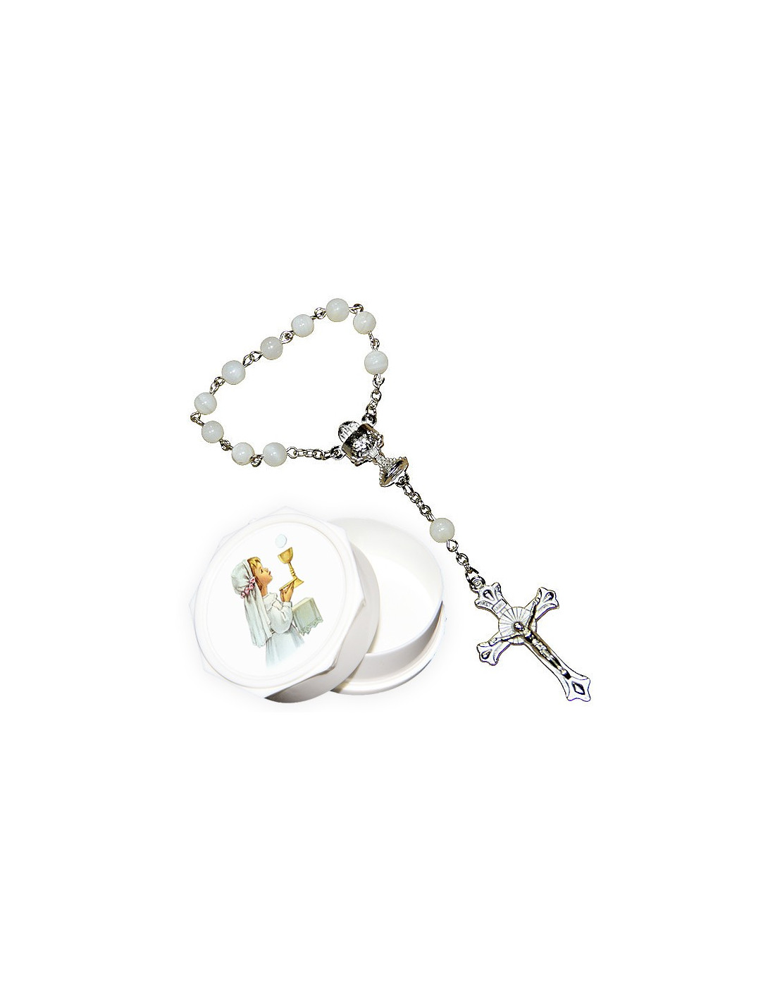 Kleine tien rozenkrans gemaakt van echte parelmoer kralen en zilveren metalen ketting in een prachtig wit doosje versierd met een klein meisje in communie. De centrale medaille is een kelk van de Eucharistie. Het kruis en de medaille zijn goed gebeiteld.