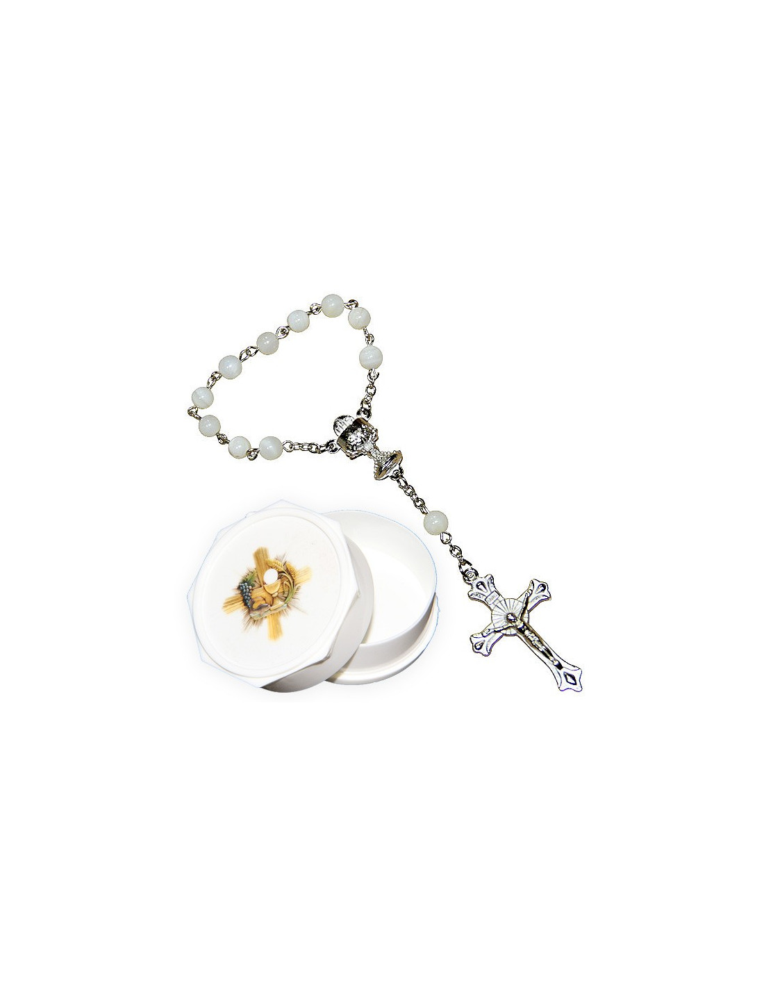 Kleine tien rozenkrans gemaakt van echte parelmoer kralen en zilveren metalen ketting in een prachtig wit doosje versierd met een kruis. De centrale medaille is een kelk van de Eucharistie. Het kruis en de medaille zijn goed gebeiteld.
