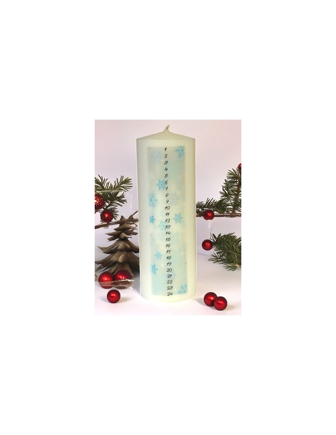 De kaars is bedrukt met een kalender van 24 dagen en begeleidt u in het zoete wachten tot de viering van de geboorte van Christus.