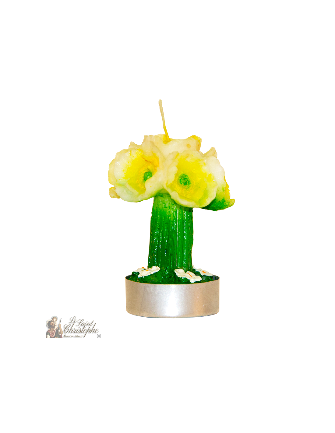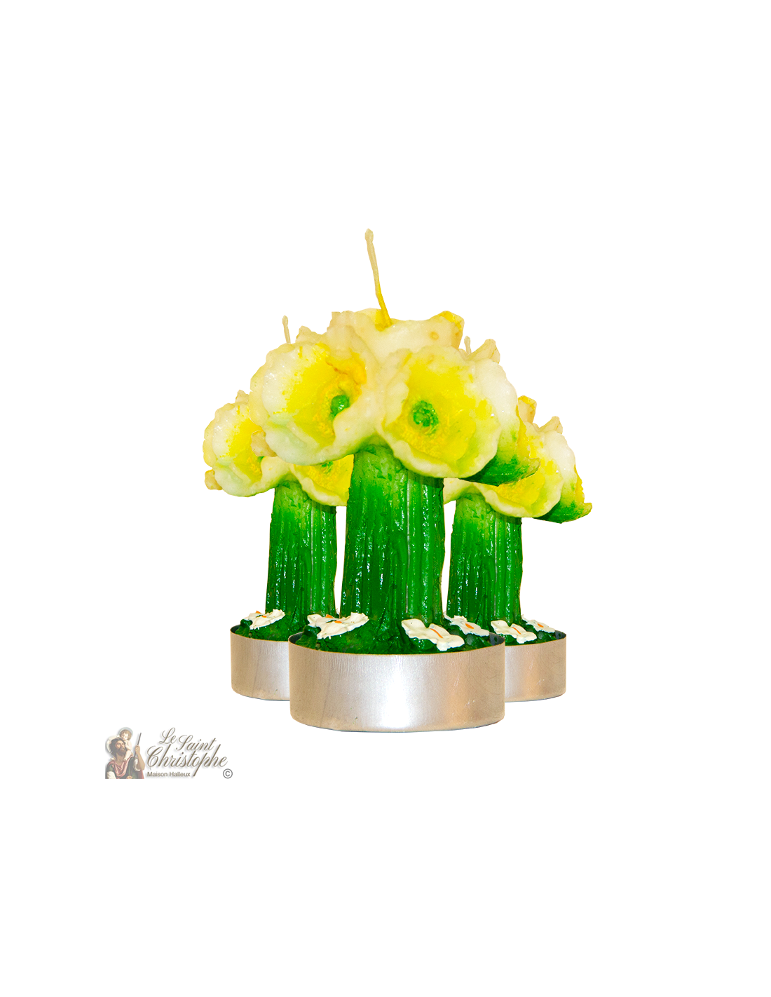 Deze decoratieve kaars in de vorm van een boeket narcissen is geschikt voor allerlei evenementen: bruiloft, feestelijke tafel, communie ... Dit artikel wordt verkocht per set van drie stuks, het brengt een homogeniteit in uw decoratie of uw interieur. Met zijn gele kleurverloop op de bloemen van het boeket is het ook ideaal als seizoensgebonden decoratie voor bijvoorbeeld het voorjaar of Pasen.