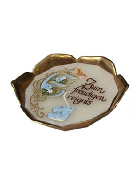 Deze handgemaakte kaars is ideaal voor een doop of geboorte en is gegoten in een mooie messing schaal in de vorm van een bloem. De was is gegraveerd, gebeeldhouwd en beschilderd met de kalligrafische zin “voor de blijde gebeurtenis” in het Duits, en kleine blauwe slofjes.