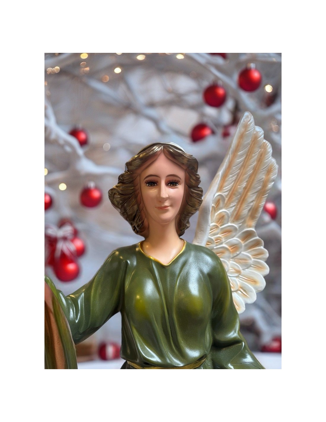 Prachtig beeld van Engel Gloria in een groene jurk, gemaakt van hars met verfijnde afwerking. Met een hoogte van 70 cm is het ideaal om een grote kerststal te vergezellen, een kerk of kapel te versieren of te dienen als spirituele decoratie.