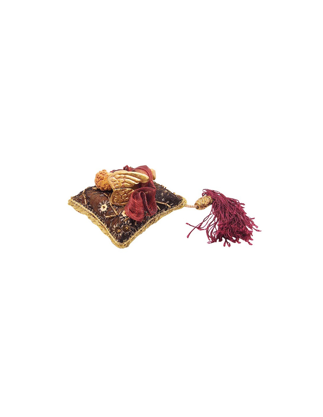 Dit charmante kussen met slapende engel is een volledig met de hand vervaardigd ambachtelijk stuk. Het delicate engeltje, dat vredig sluimert op een kussen versierd met kostbare stoffen, parels en pompons, brengt onmiddellijk zachtheid en sereniteit. Ideaal voor een slaapkamer, een gebedshoekje of een warm interieur, het is een verfijnd cadeau voor een geboorte, een doop of een symbolisch moment. Een echte talisman van tederheid.