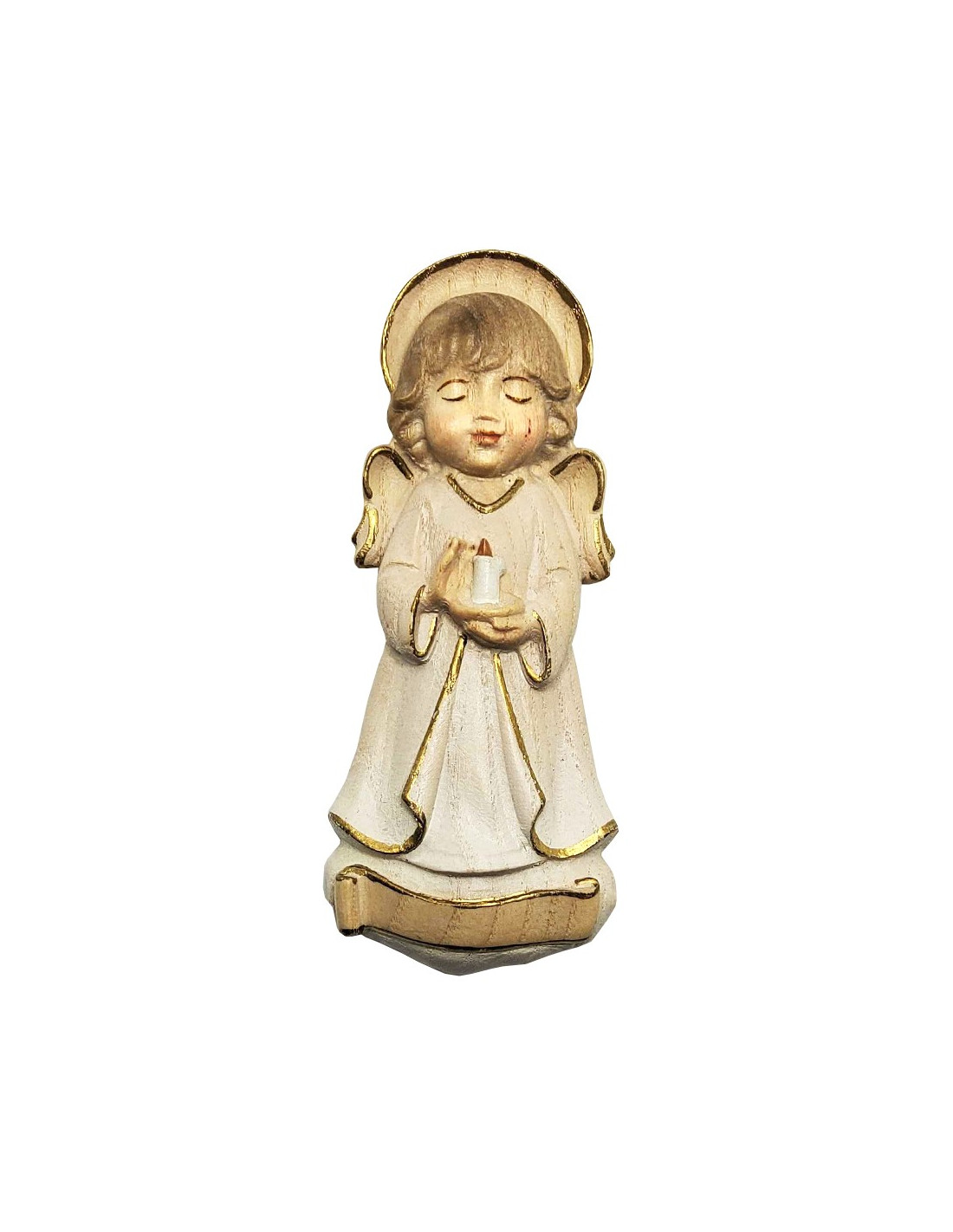 Wandplaatje met kleine beschermengel om in uw interieur op te hangen en een spiritueel tintje aan uw decoratie te geven. Deze kleine engel in pastelkleuren is verfraaid met goudverf voor een stralend effect. De engel wordt afgebeeld met gesloten ogen en een kaars in zijn handen. Op een perkamentrol onderaan de plaat kan het hout door een graveur worden gepersonaliseerd met de voornaam van een dierbare. Deze engel is ideaal voor een kinderkamer, zodat hij 's nachts over het kind kan waken en het kan beschermen, of als cadeau voor een communie of doop.