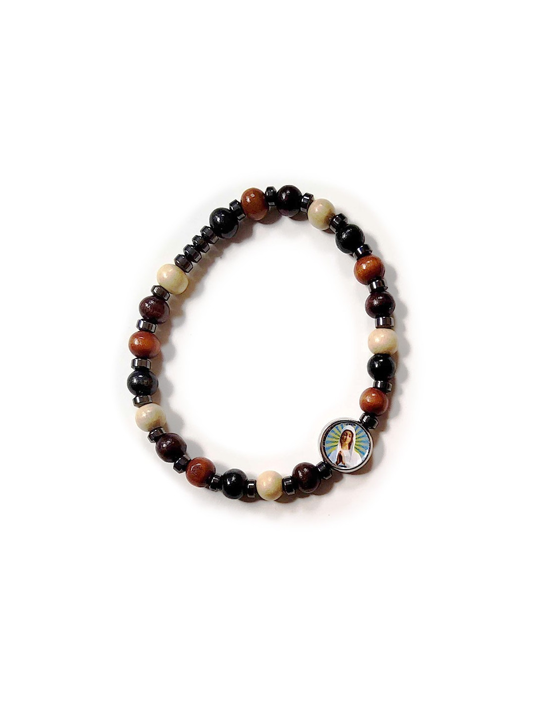 Elastische armband van hout en hematiet die gebruikt kan worden als tienling, ook wel dizainier genoemd, met een afbeelding van de Maagd van Banneux: Onze-Lieve-Vrouw van de Armen. De houten kralen zijn wit, bruin en zwart gekleurd.