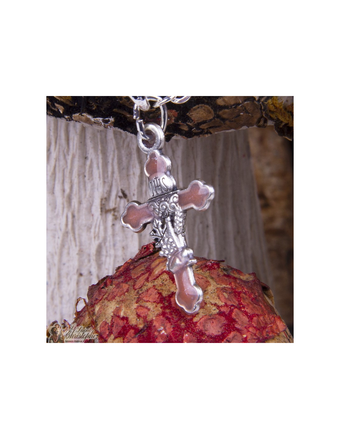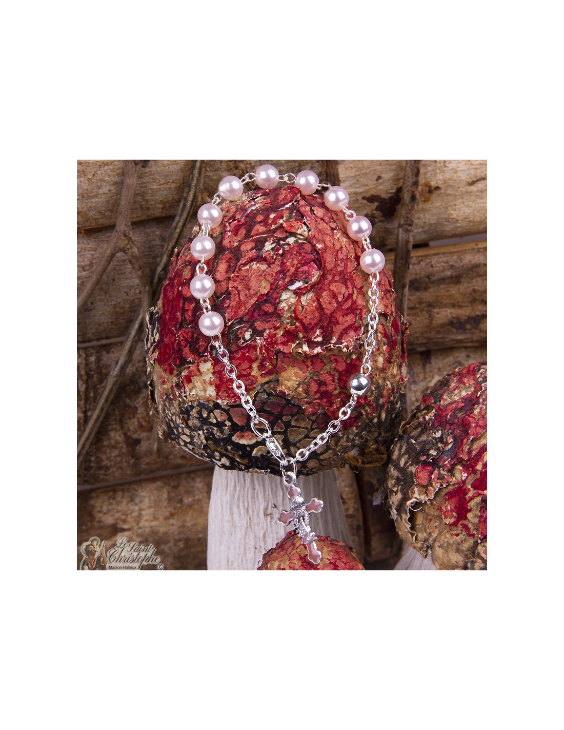 Deze rozenkransarmband combineert roze parelmoer kralen met een kruis en kelk, symbolen van geloof, bescherming en bezinning.